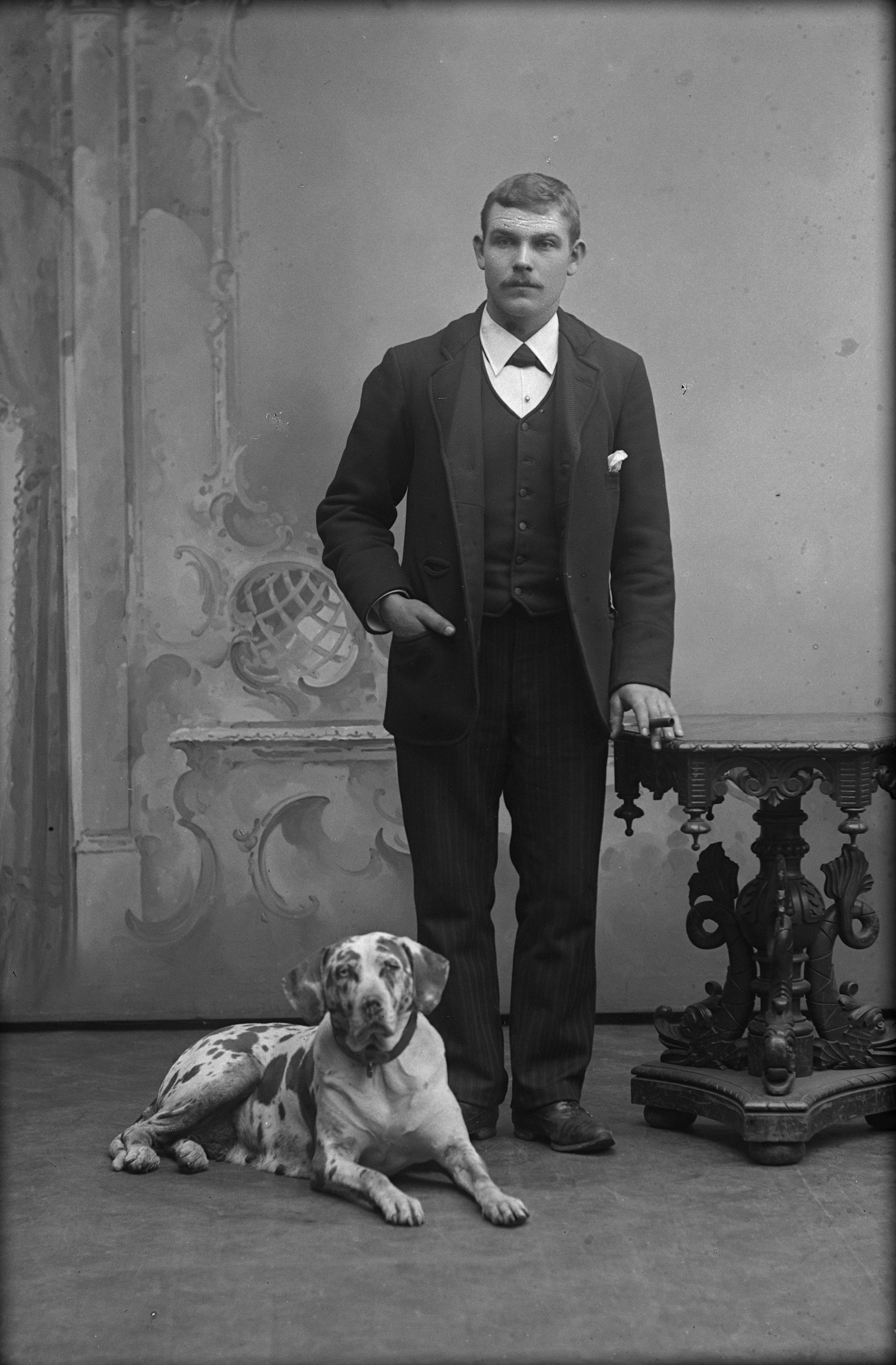 Porträtt i helfigur av Nils Nilsson, stående vid pelarbord, med sin hund liggande på golvet.