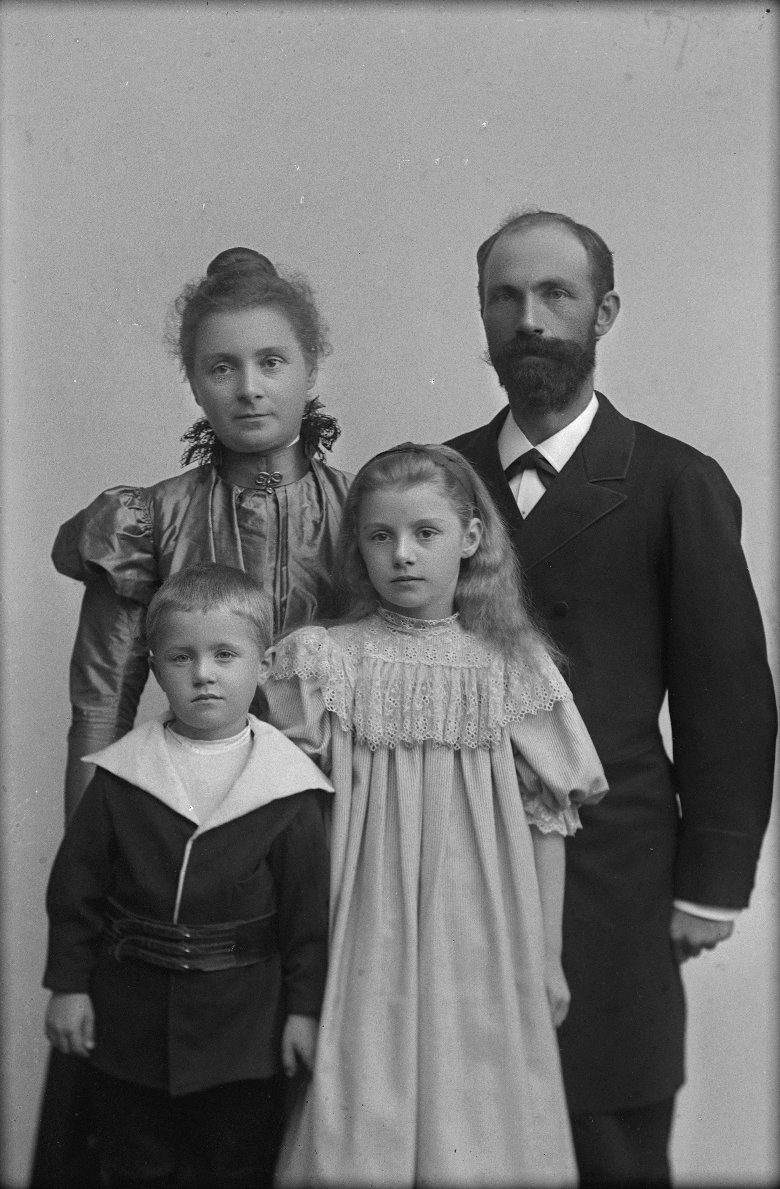 Beskrivning: Porträtt i helfigur av herr Laurin med familj. Sonen iklädd sjömanskostym.