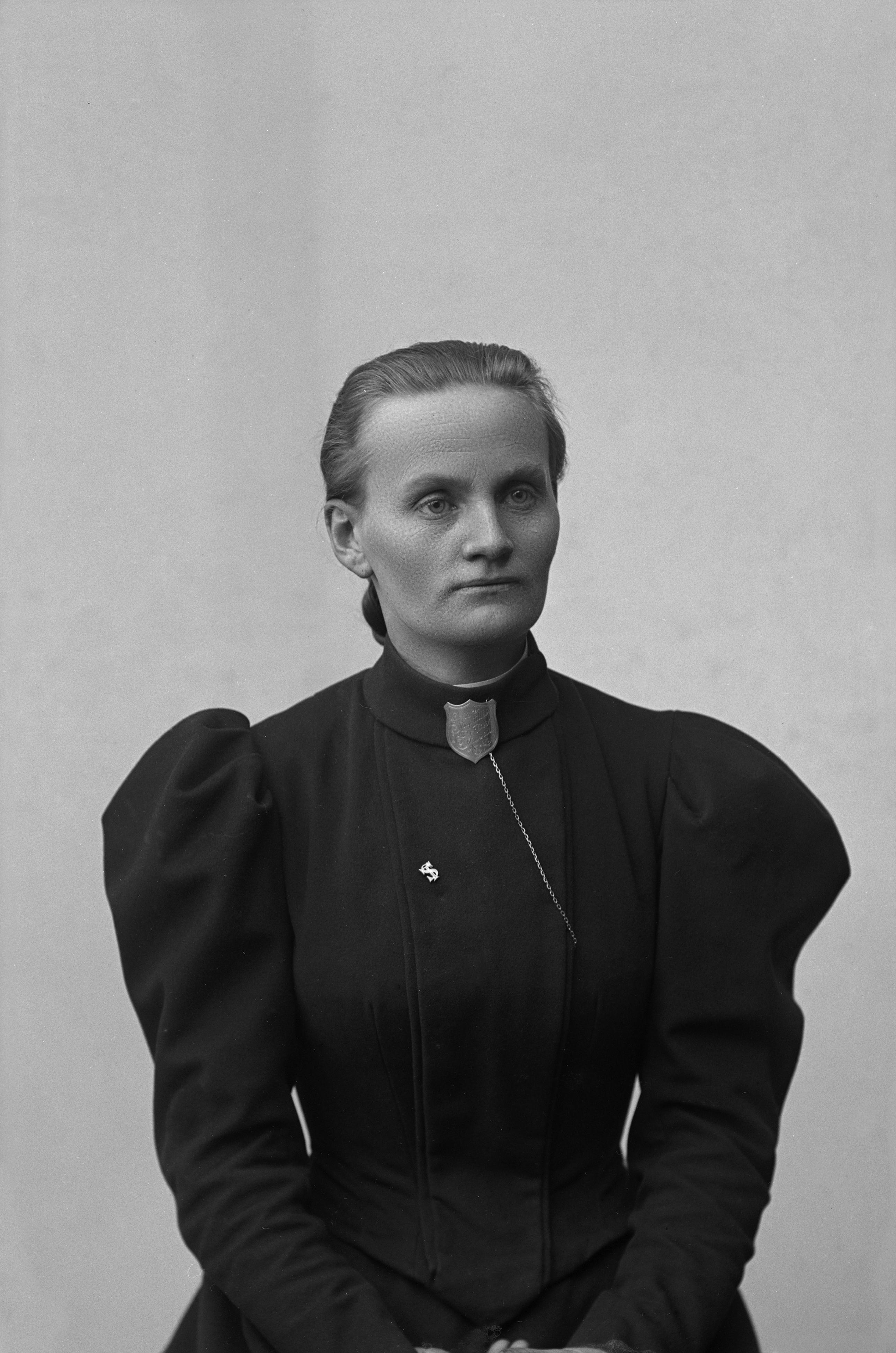 Beskrivning: Porträtt i halvfigur av Jenny Hedenkrona vid Malmö Yllefabrik.