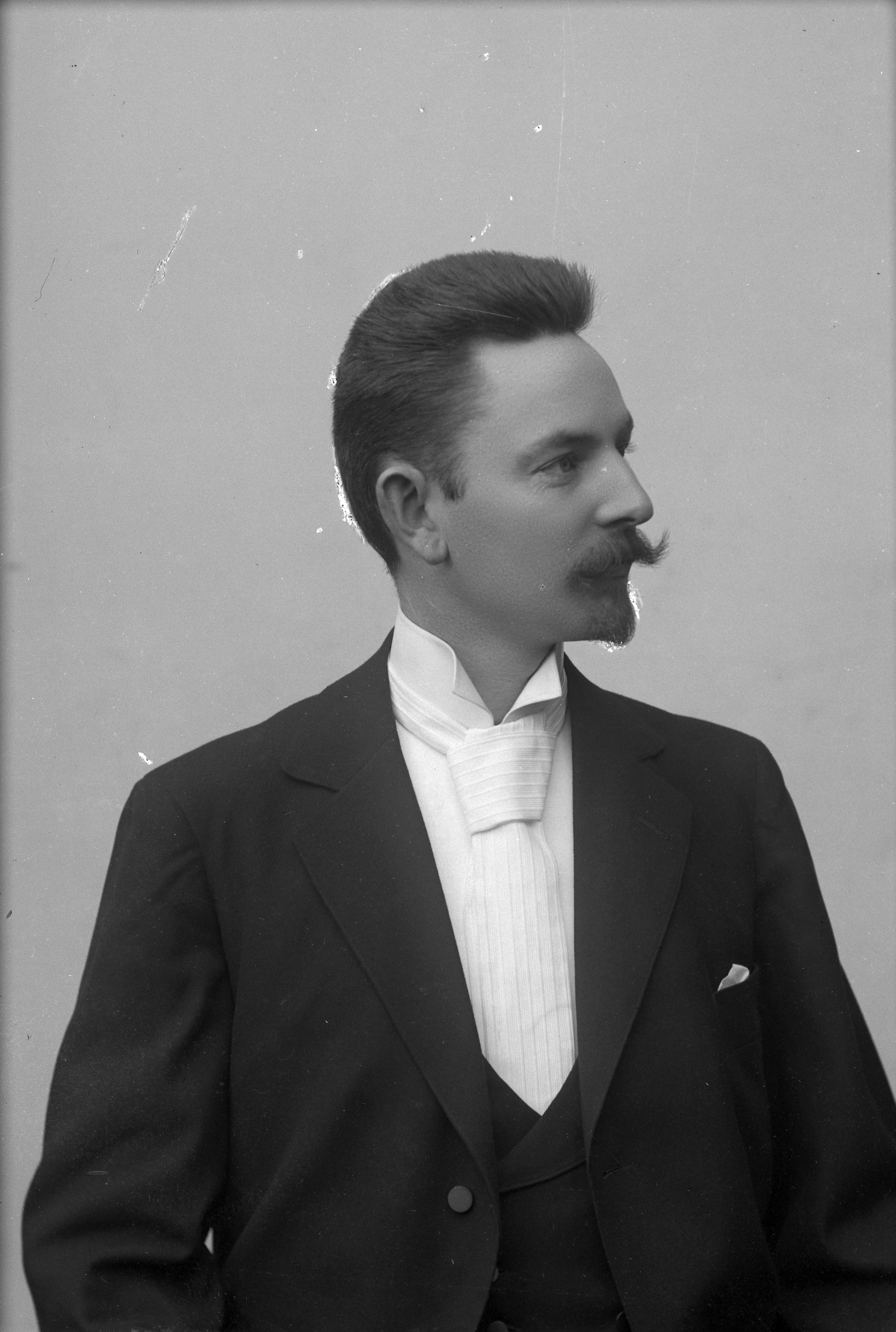 Porträtt i halvfigur av herr Erkström, ansikte i profil.