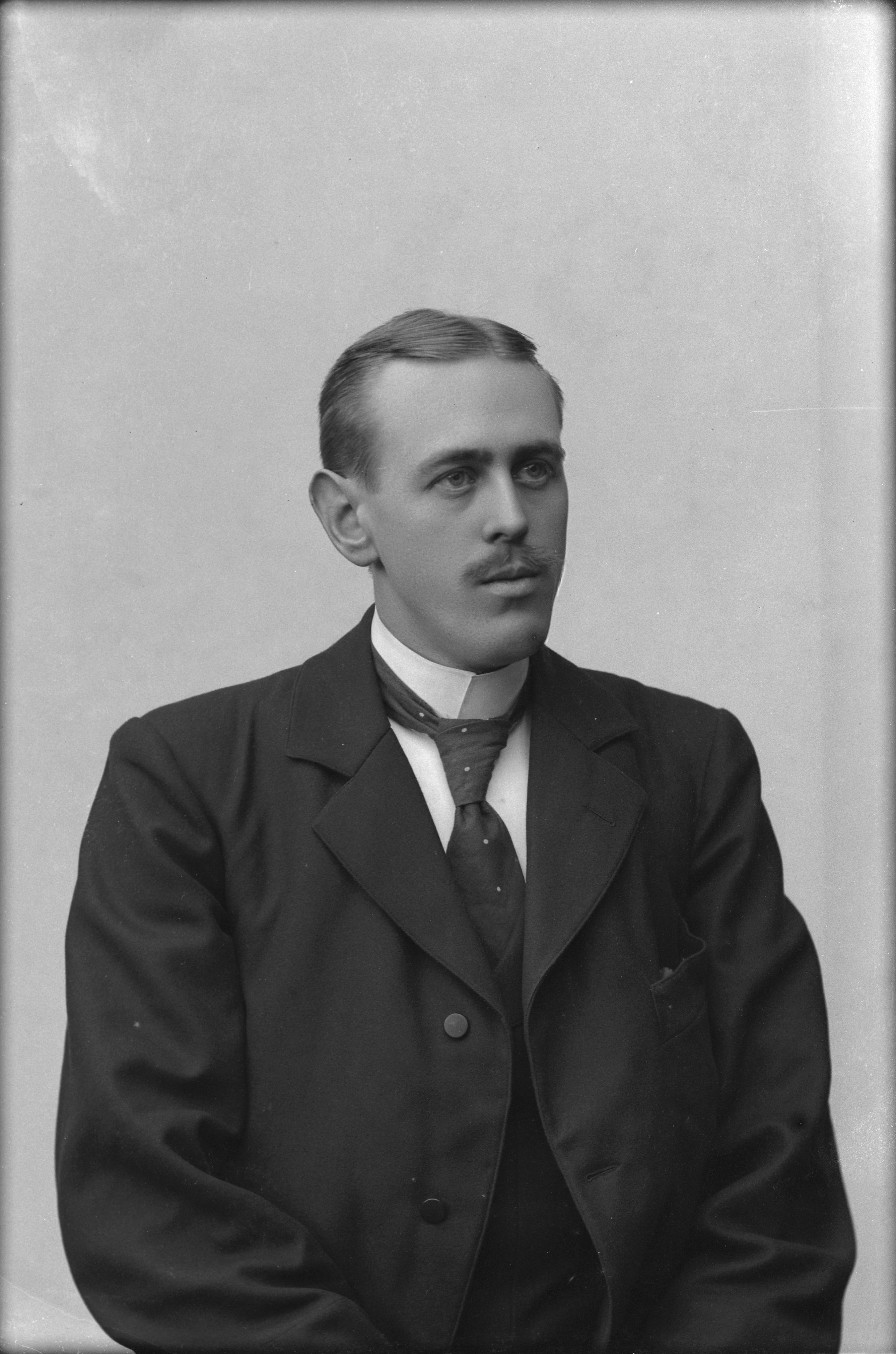 Beskrivning: Porträtt i halvfigur av postexpeditör Kjäll Persson.