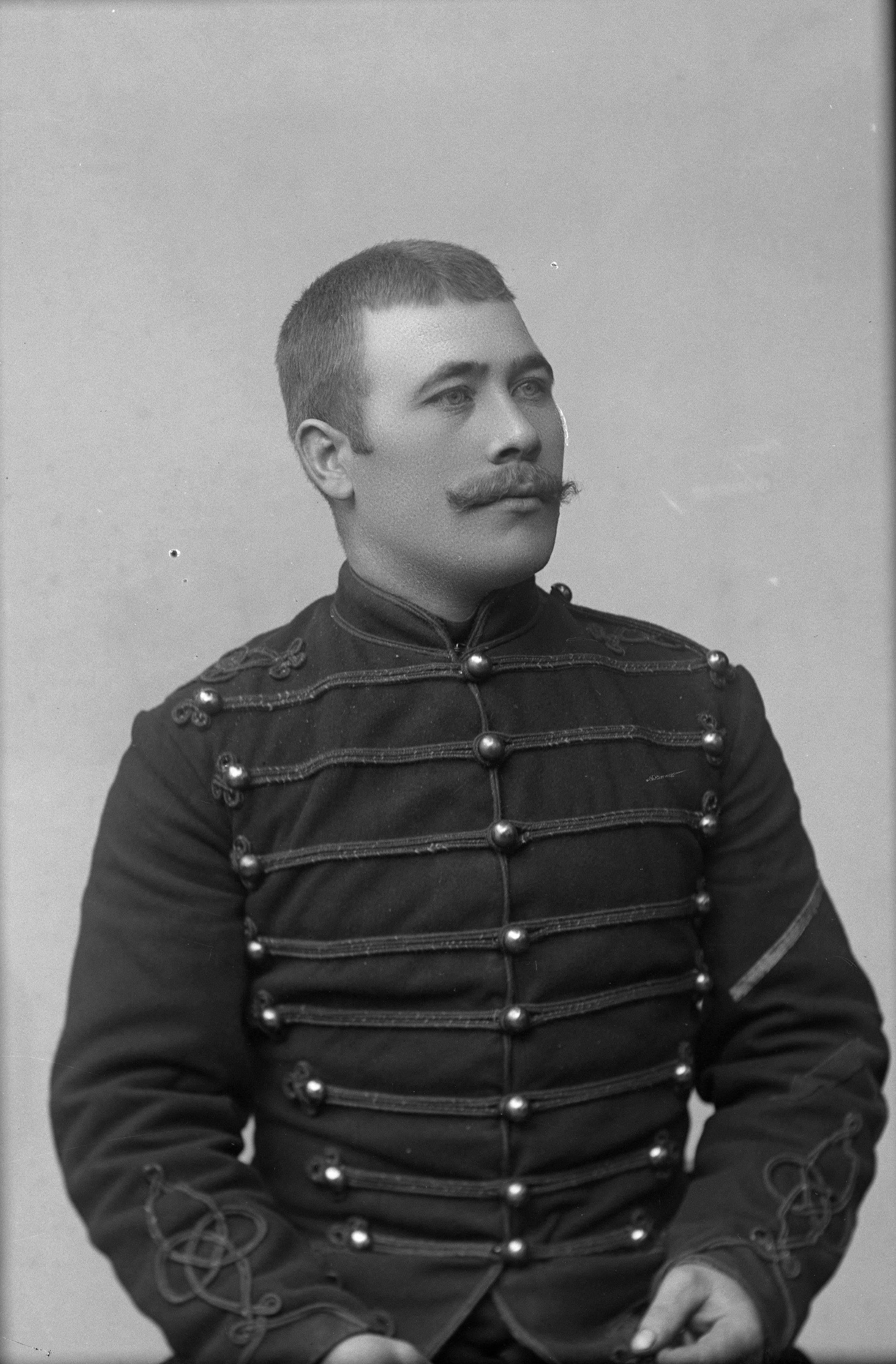 Porträtt i halvfigur av husar Tornberg, iklädd militäruniform.