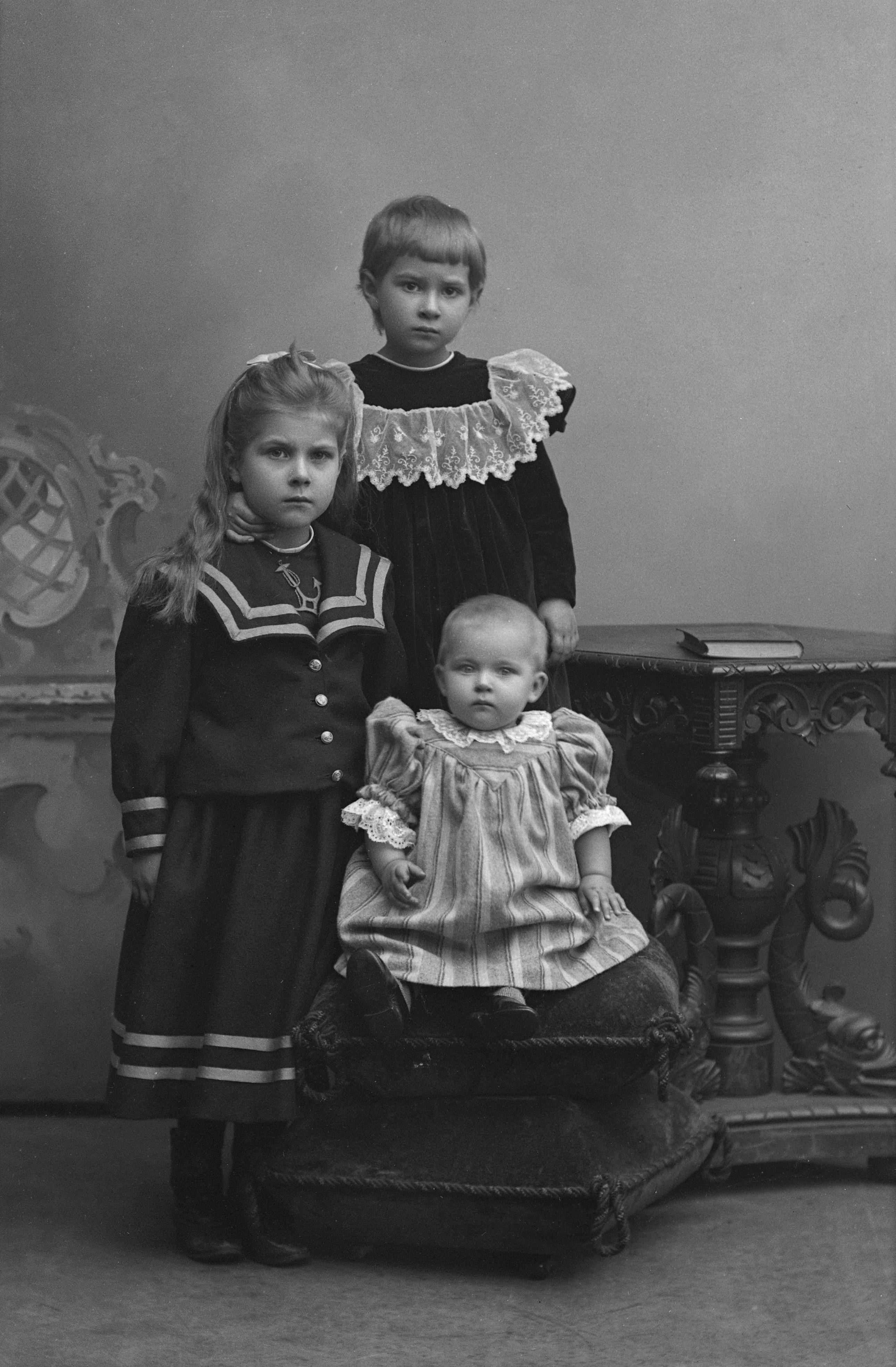 Porträtt i helfigur av Agda Berta Maria, Vanda Ingeborg Maria och Teodora Elisabet Grönvall, stående vid pelarbord. Teodora Elisabet sittande på dyna, Vanda med rosett i håret, iklädd sjömanskostym. På bordet ligger en bok.