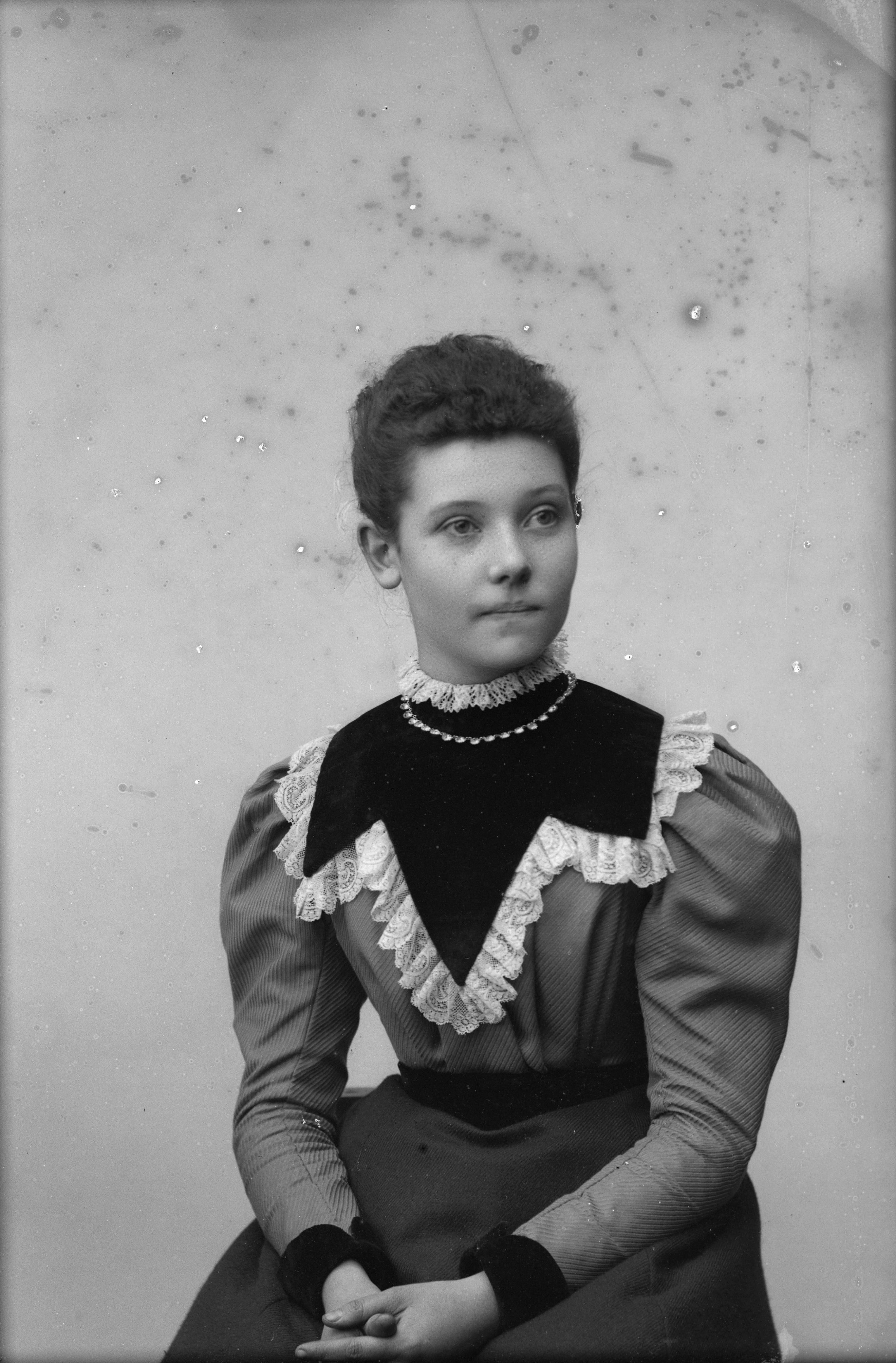 Beskrivning: Porträtt i halvfigur av Rut eller Ebba Erman /Sövde.