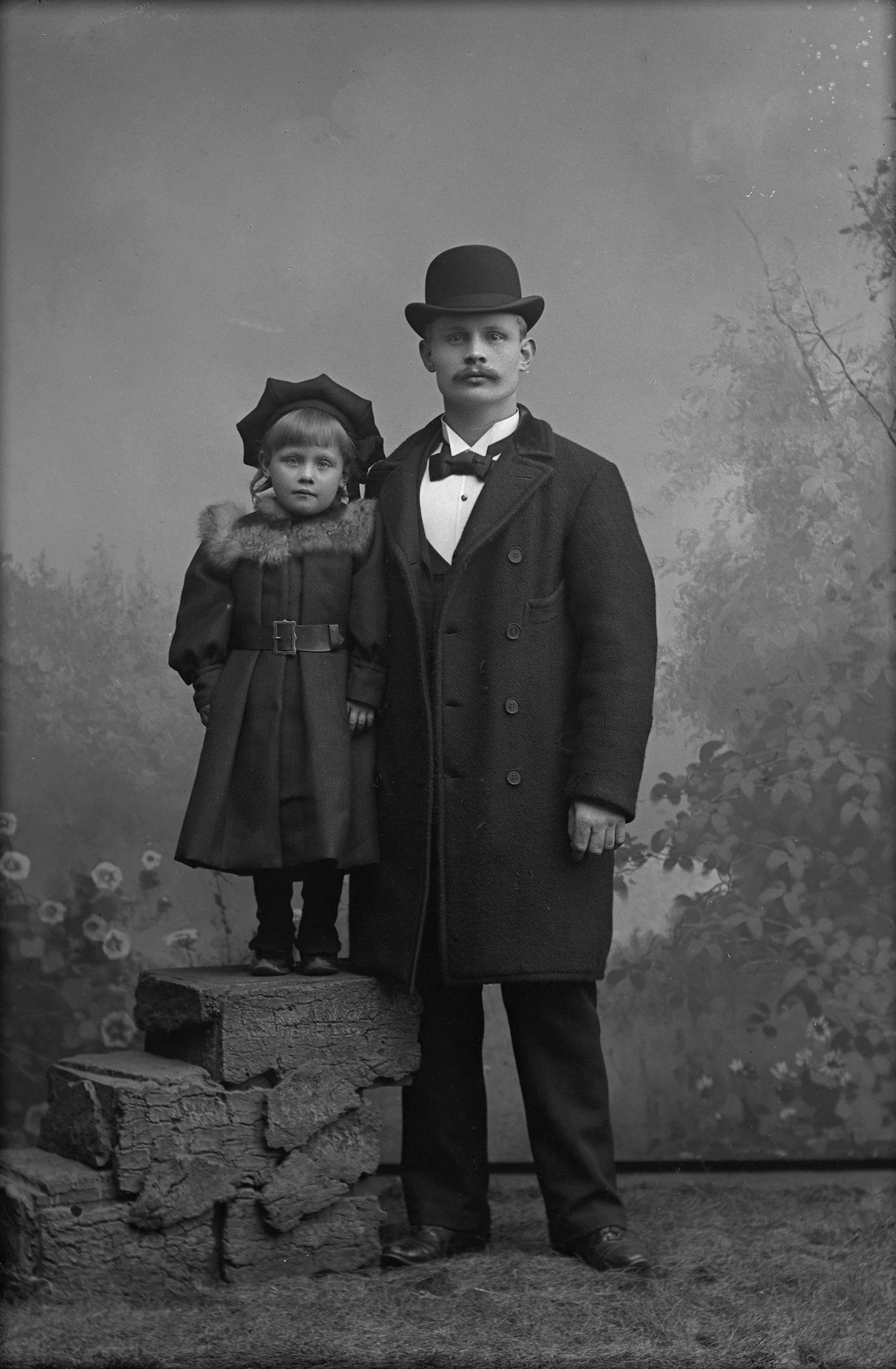 Porträtt i helfigur av E. Lundquist med dotter. Fadern iklädd plommonstop och ytterrock. Dottern iklädd ytterkappa och mössa, stående på stentrappa. Fotograferade framför ateljéfond med skogs- och blomstermotiv.