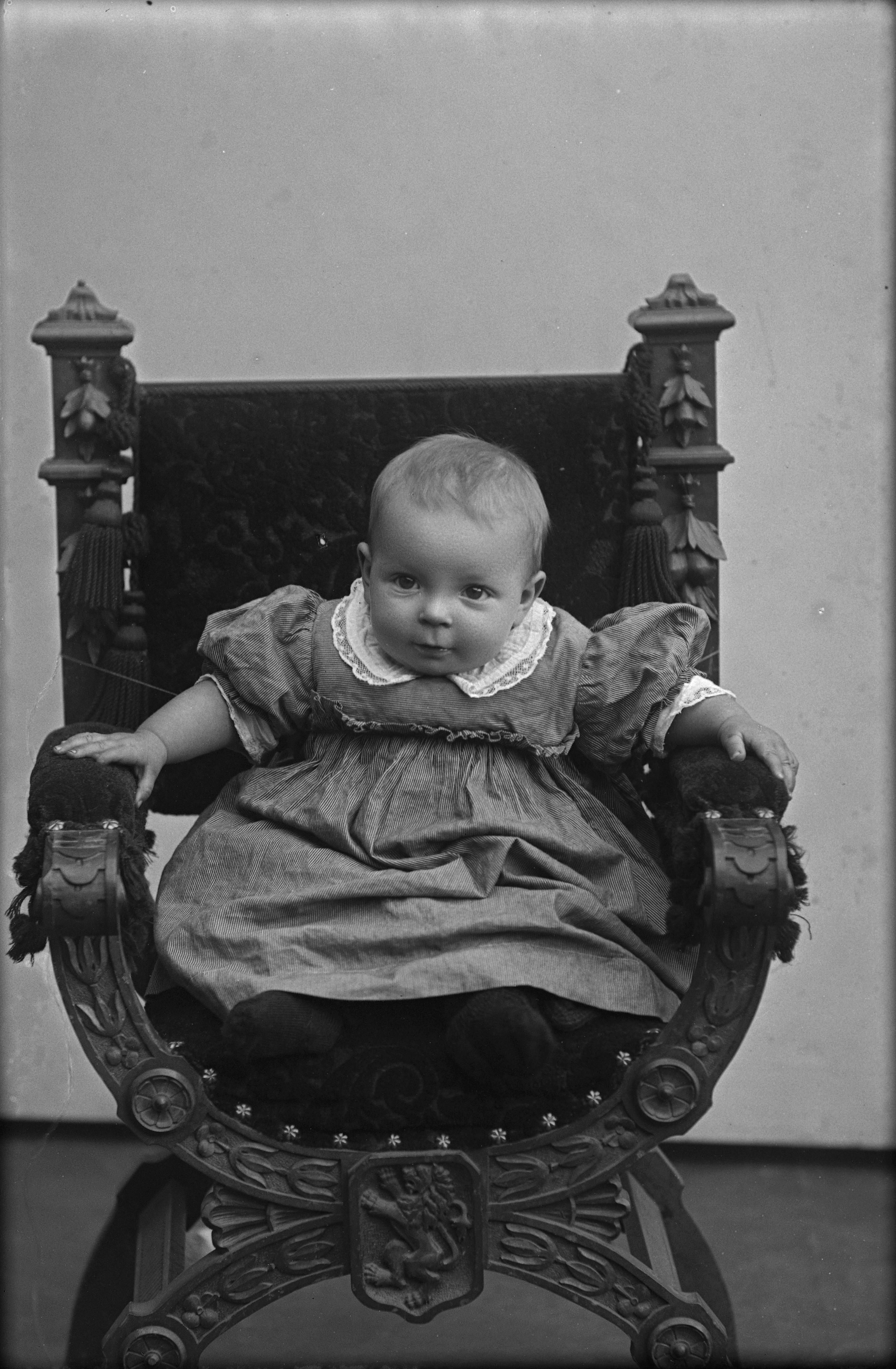 Beskrivning: Porträtt i helfigur av Olssons dotter sittande i munkstol.