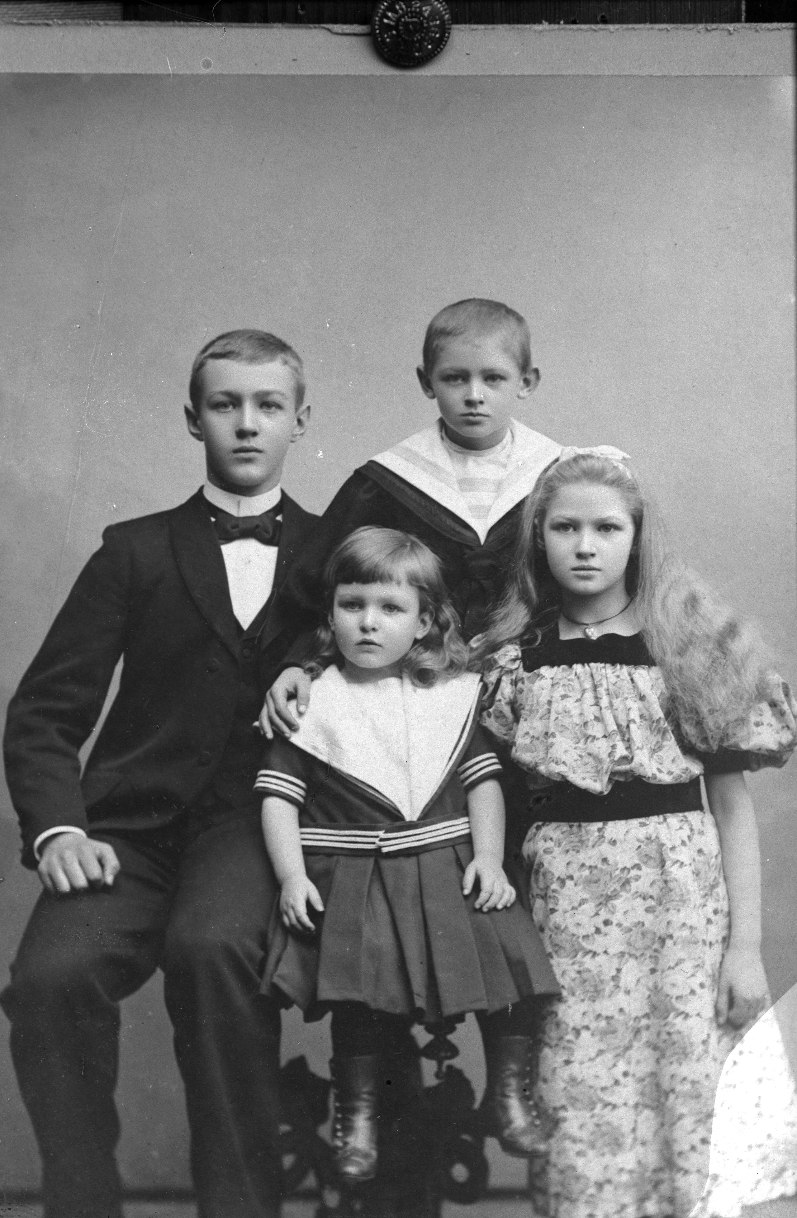 Porträtt helfigur av Streifferts söner och döttrar, sittande och stående. Två av barnen iklädda sjömanskostym, ena dottern med rosett i håret.