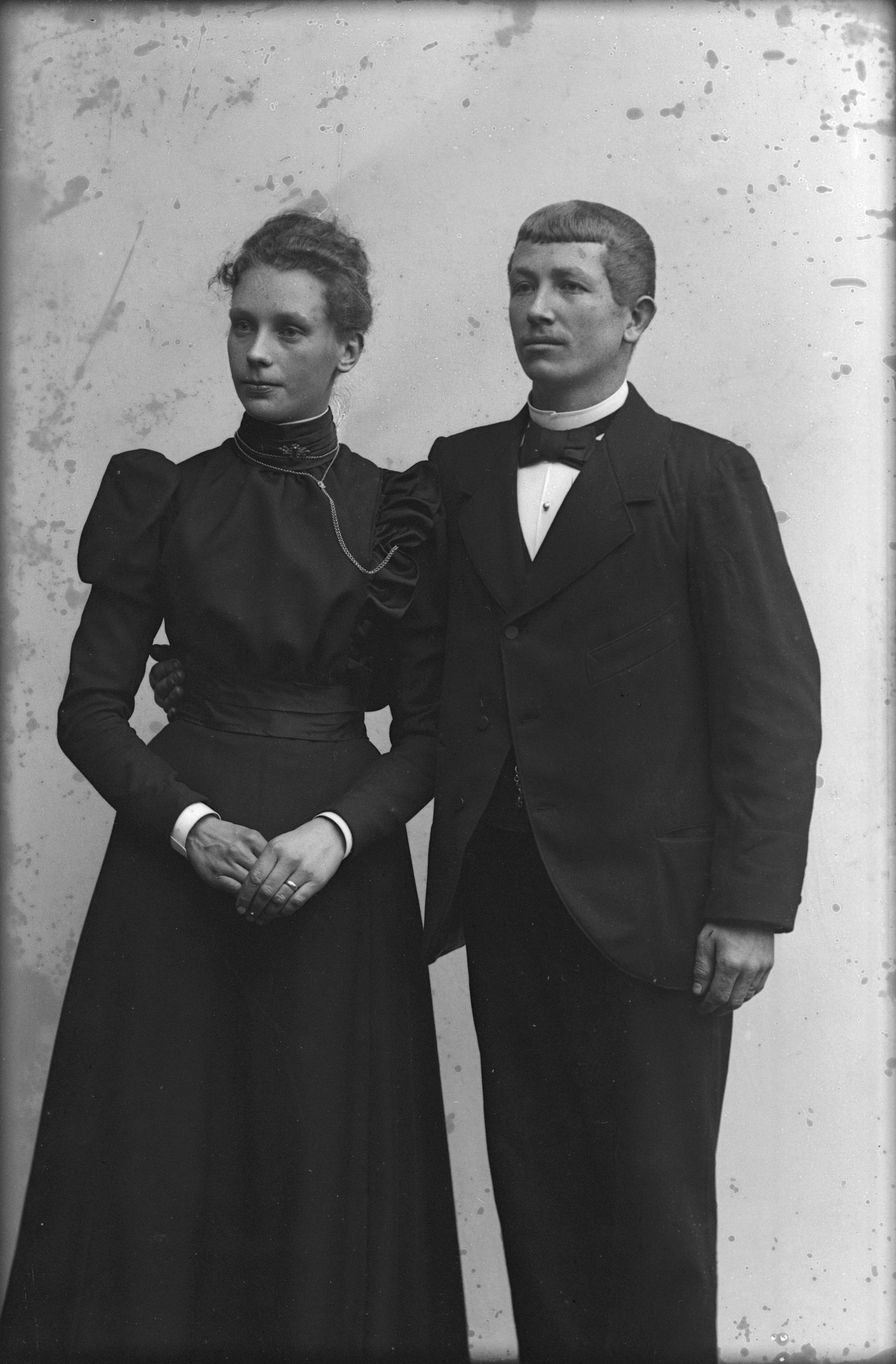 Beskrivning: Porträtt i helfigur av Hilda Nilsson med fästman.