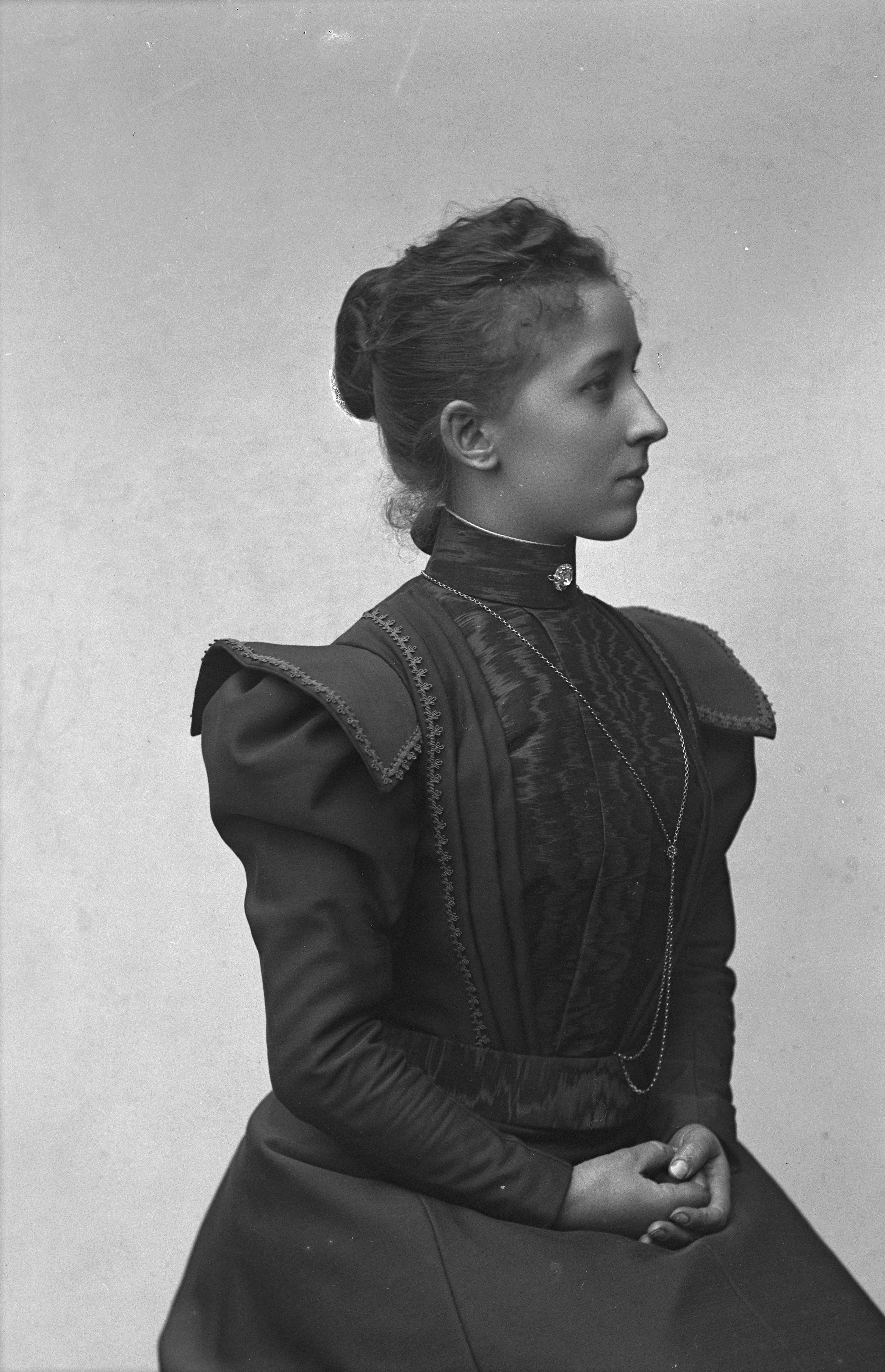 Porträtt i halvfigur av Sigrid Winberg vid J. G. Hedbergs Bokhandel, ansikte i profil.
