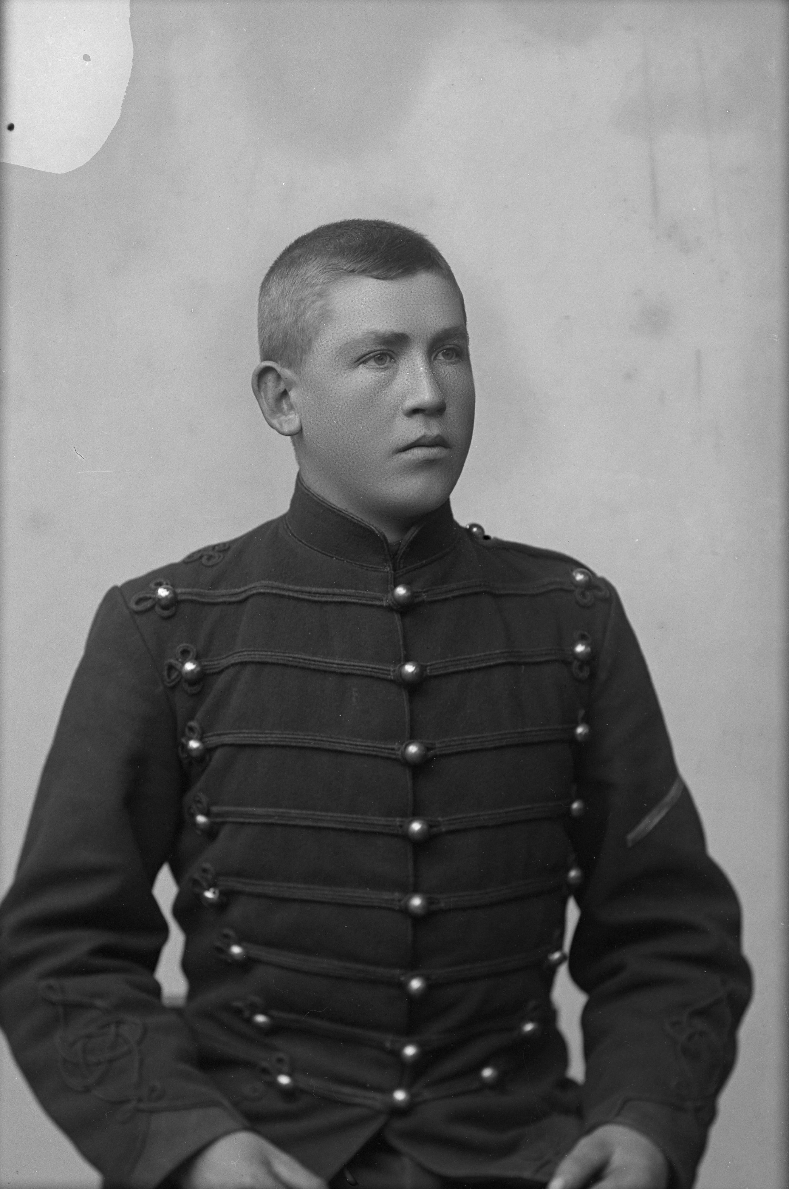 Porträtt i halvfigur av husar Lundin, iklädd militäruniform.