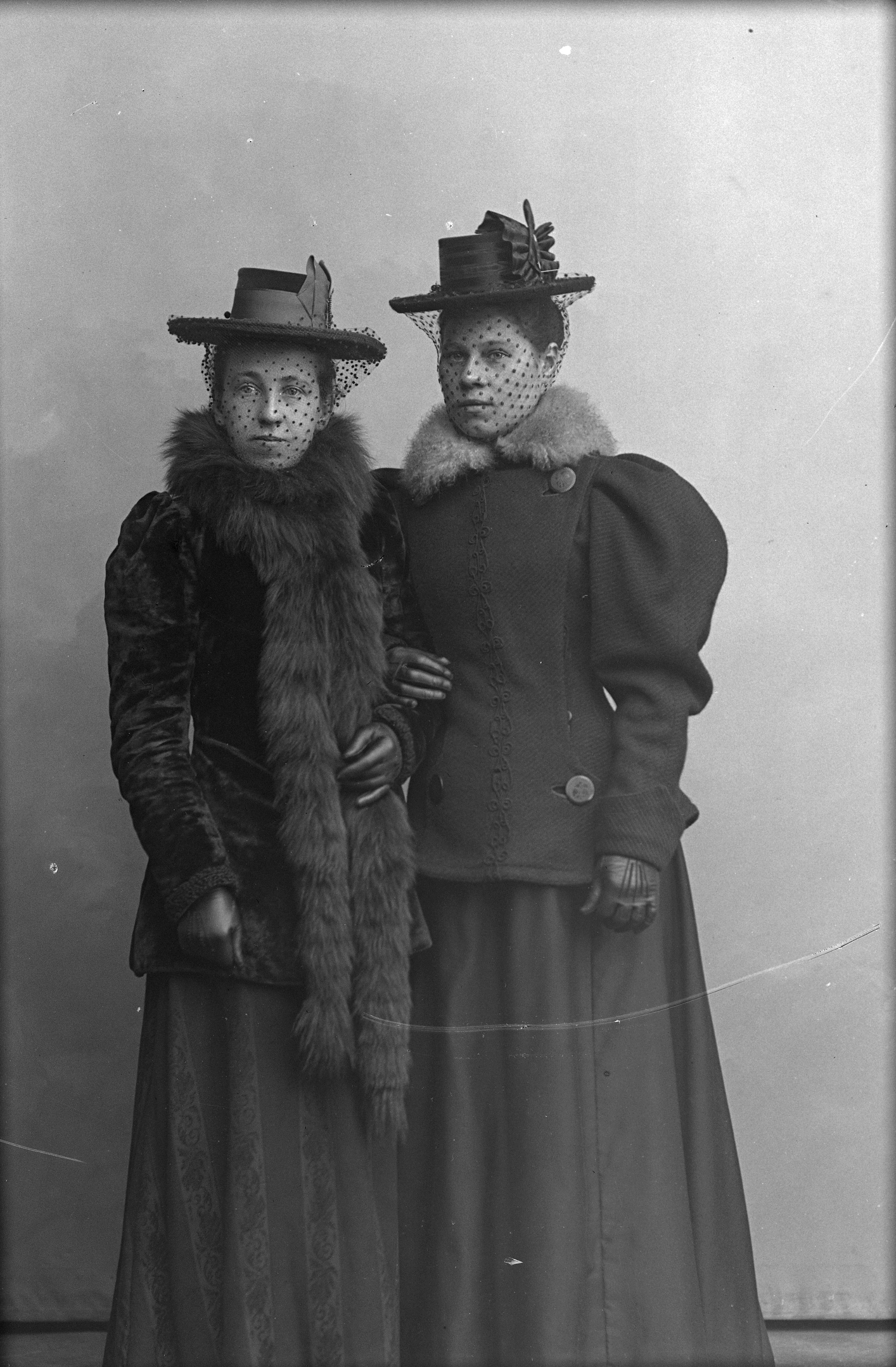 Porträtt i helfigur av Emilia Rosendahl med okänd kvinna. Båda iklädda hattar och kappor med päls.