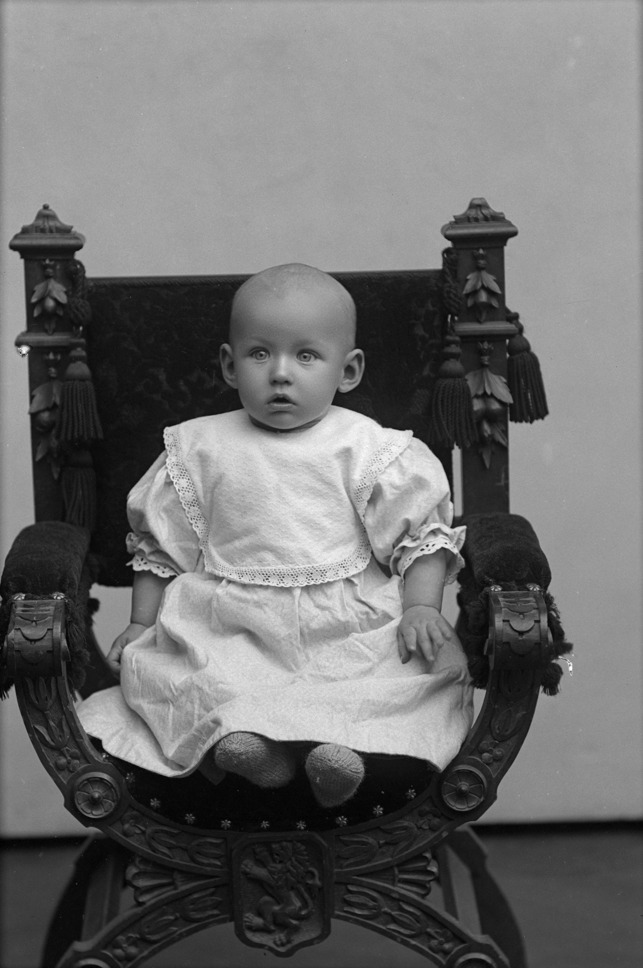 Porträtt i helfigur av Lars Magnussons son, sittande i munkstol.