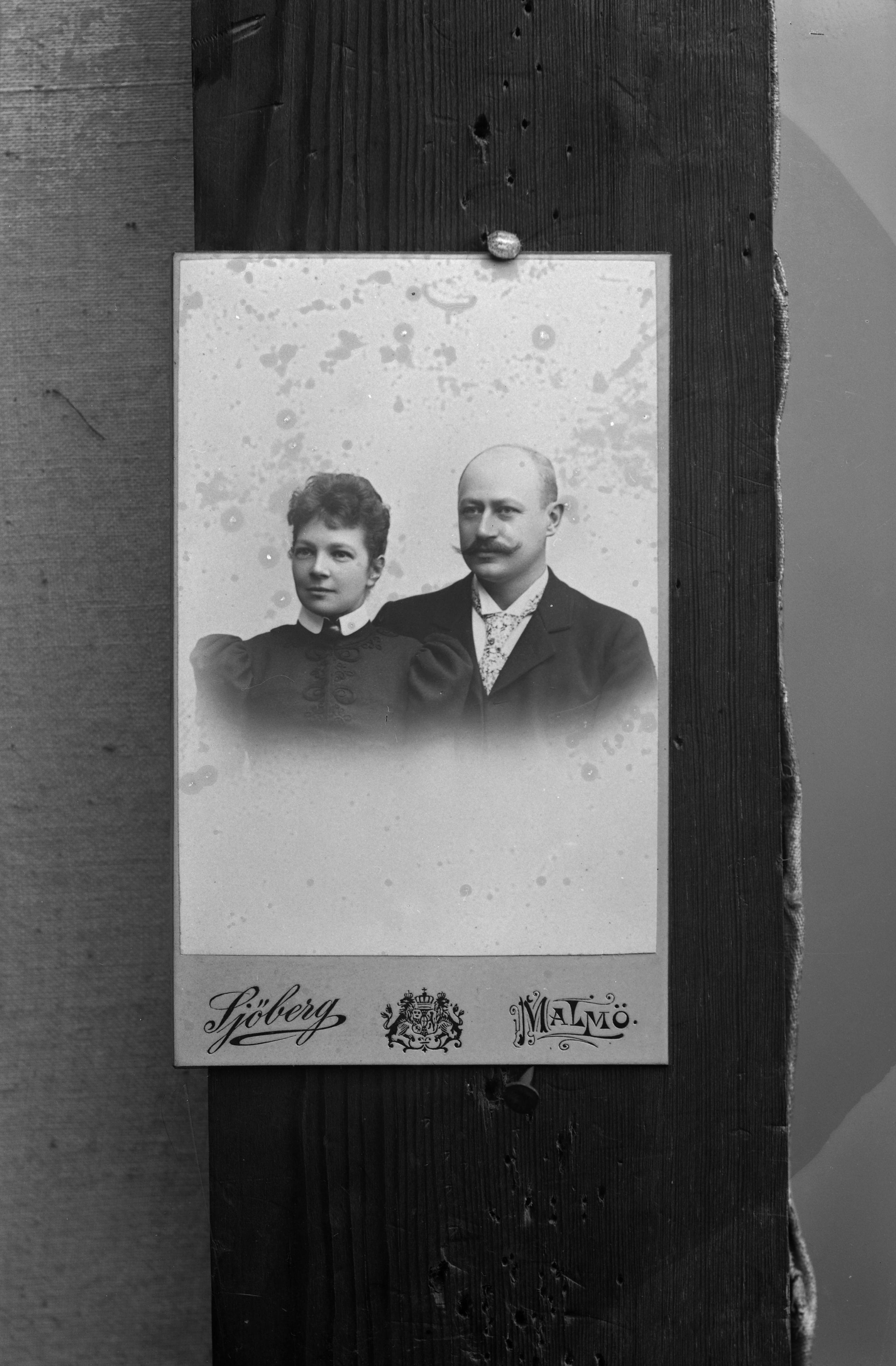 Beskrivning: Porträtt i halvfigur av kammarskrivare Olsson med fru. Visitkort med ateljélogotyp "Sjöberg /Malmö".