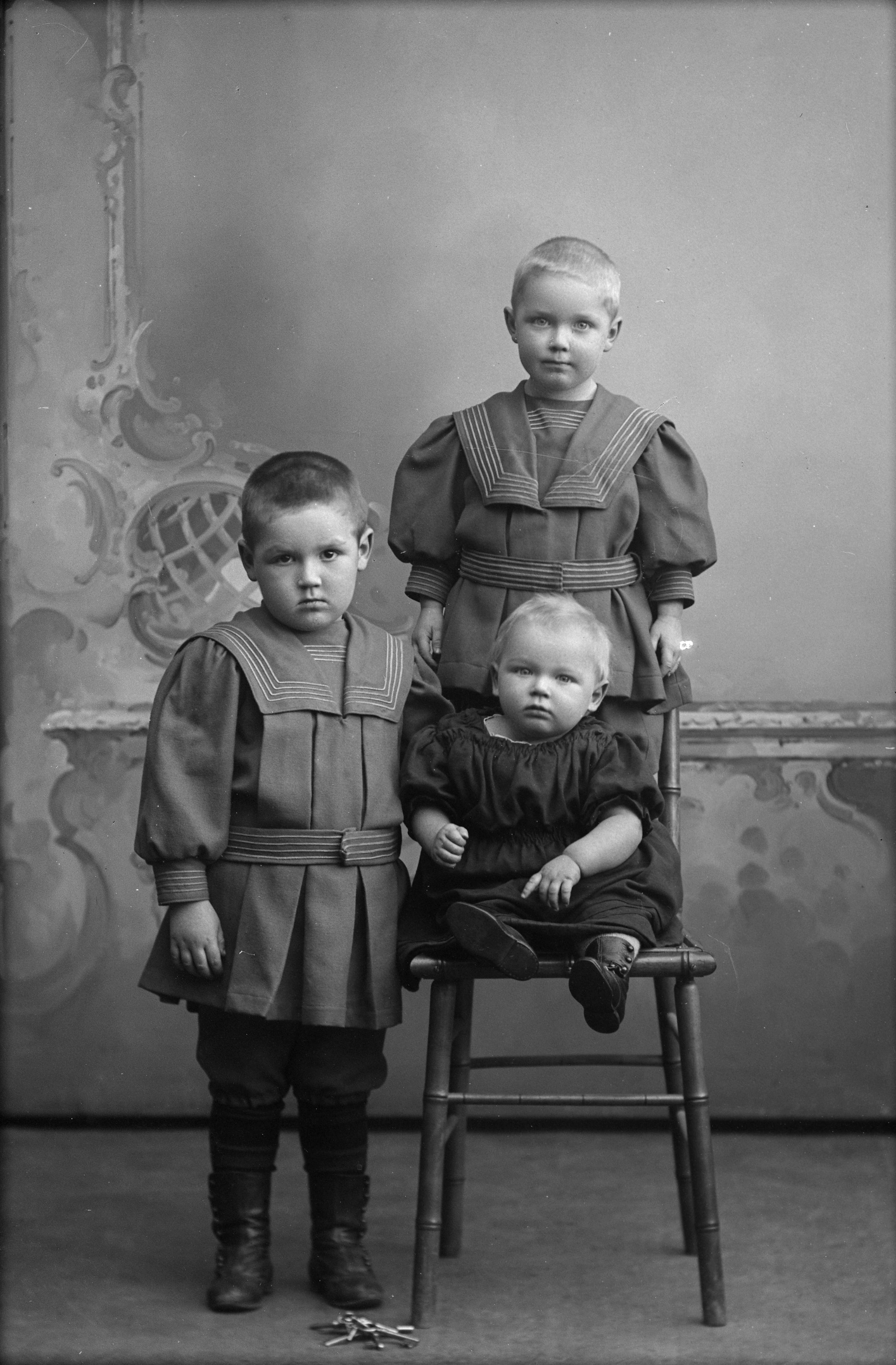Porträtt i helfigur av herr Dahlströms barn, det yngsta sittande på stol. Sönerna iklädda sjömanskostym.