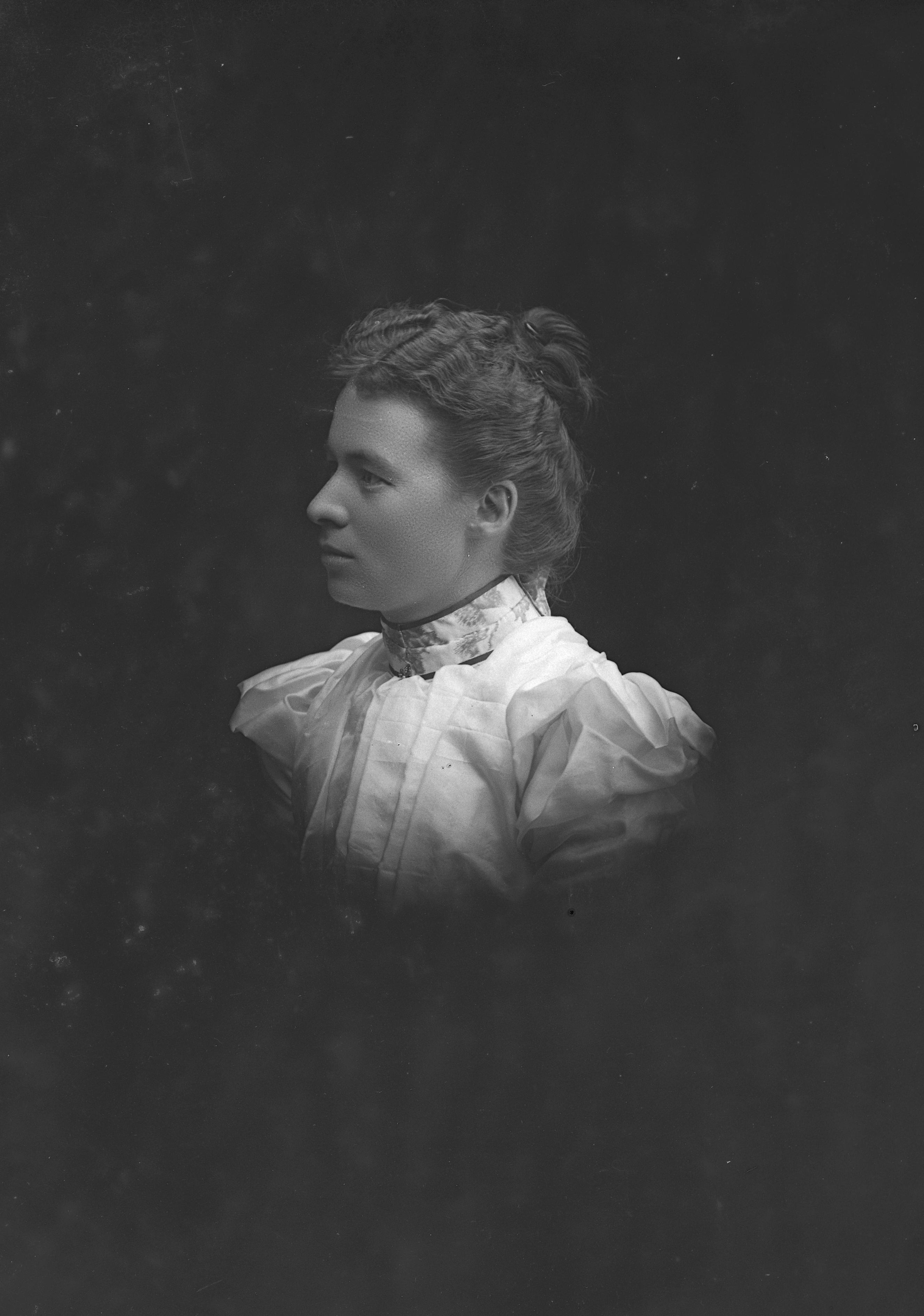 Porträtt i halvfigur av Anna Lindgren, ansikte i profil.
