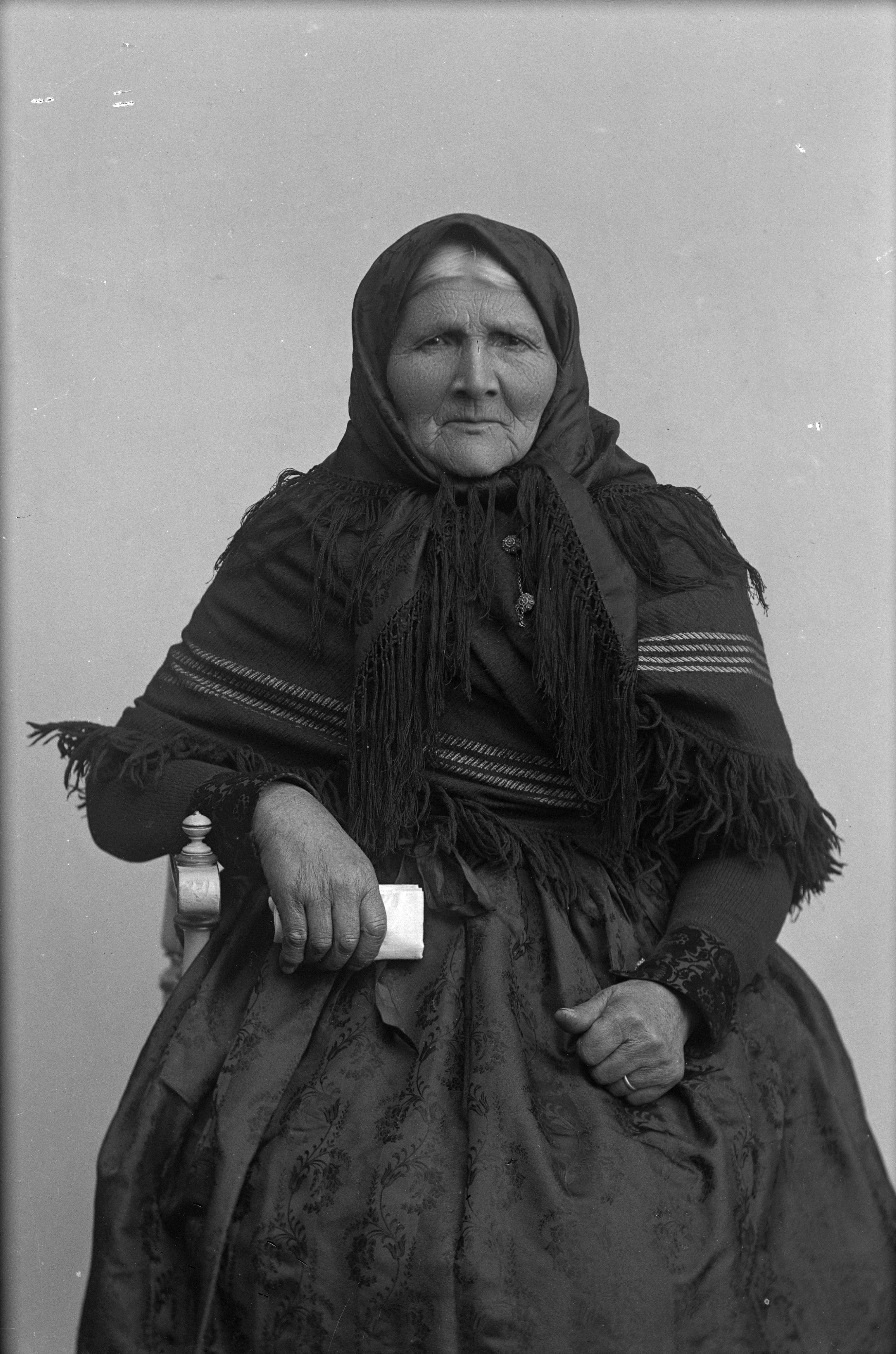 Porträtt i helfigur av Gertrud Persdotter, iklädd sjal, sittande i stol.