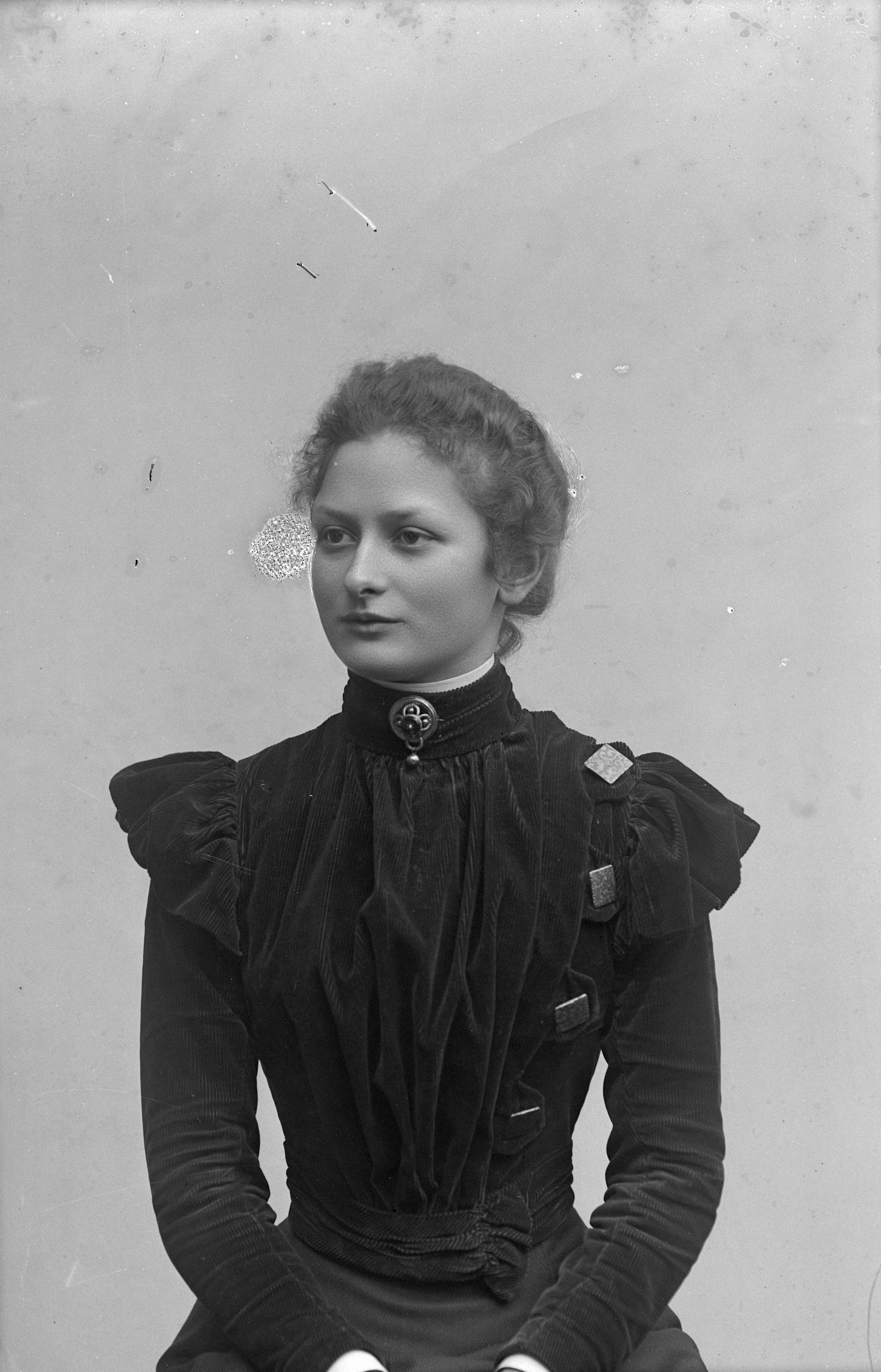 Beskrivning: Porträtt i halvfigur av Alma Fredriksson.