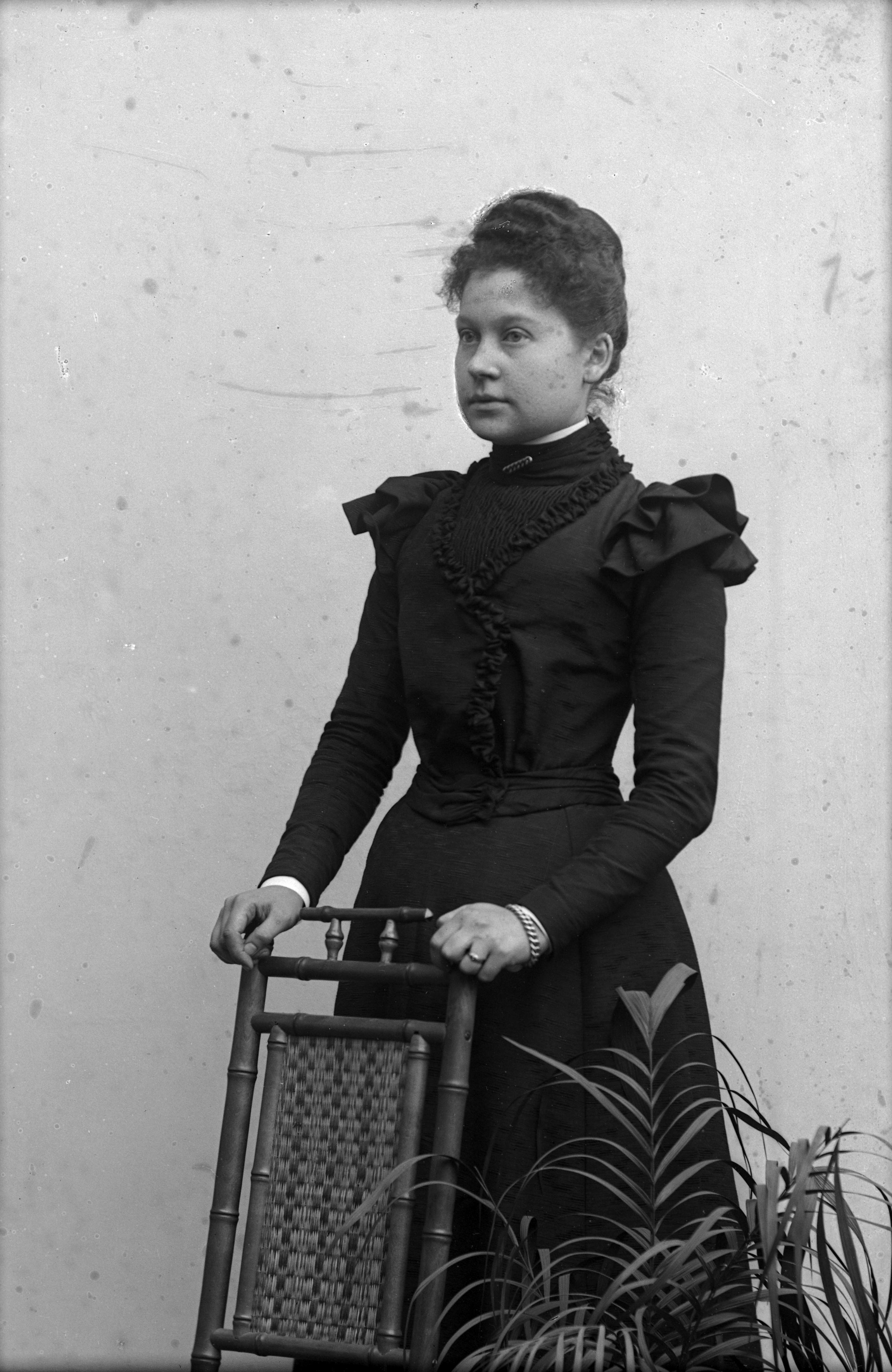 Porträtt i helfigur Alma Månsson, stående vid stol.