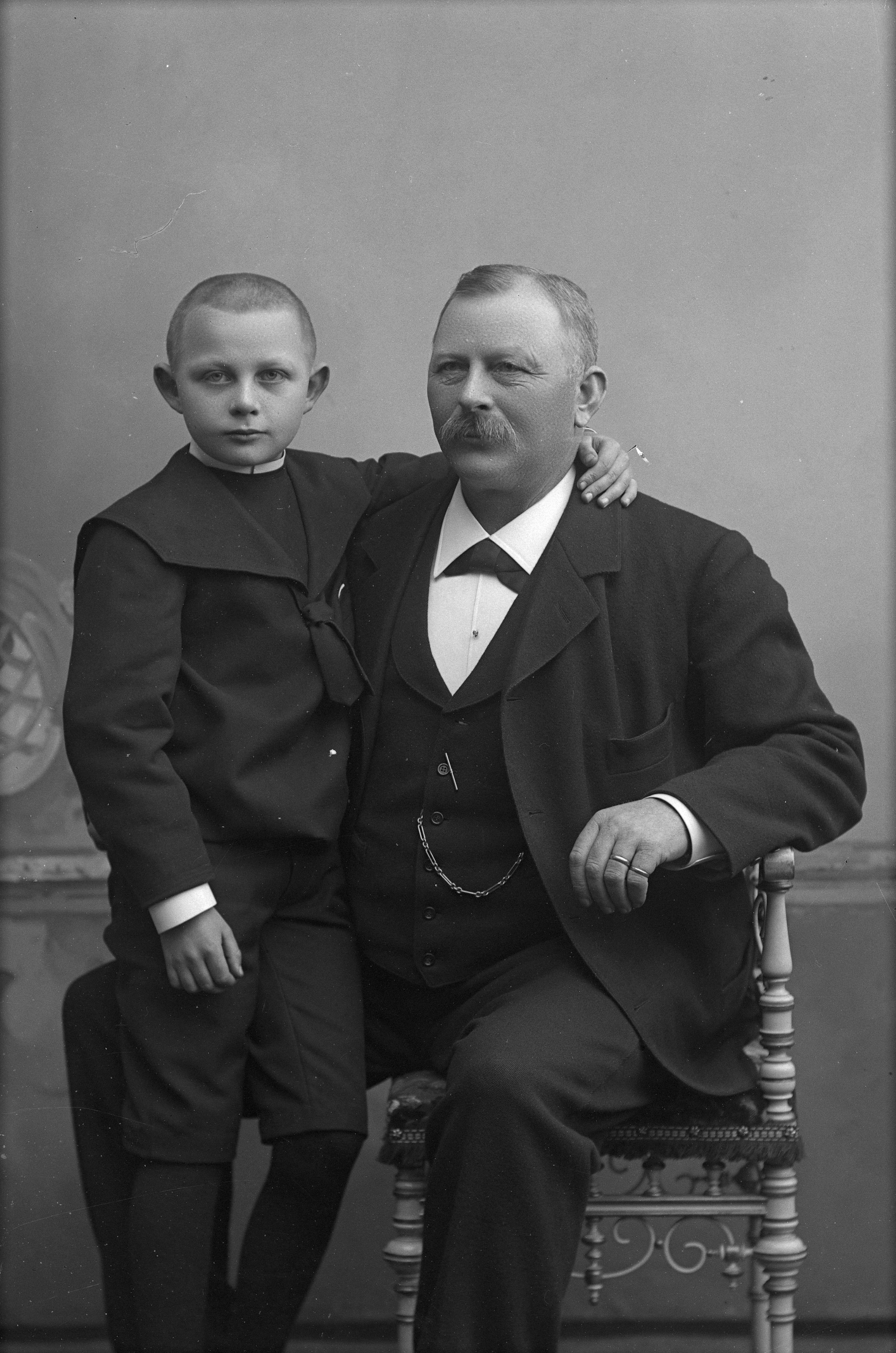 Beskrivning: Porträtt i helfigur av L. Andersson med son. Fadern sittande.