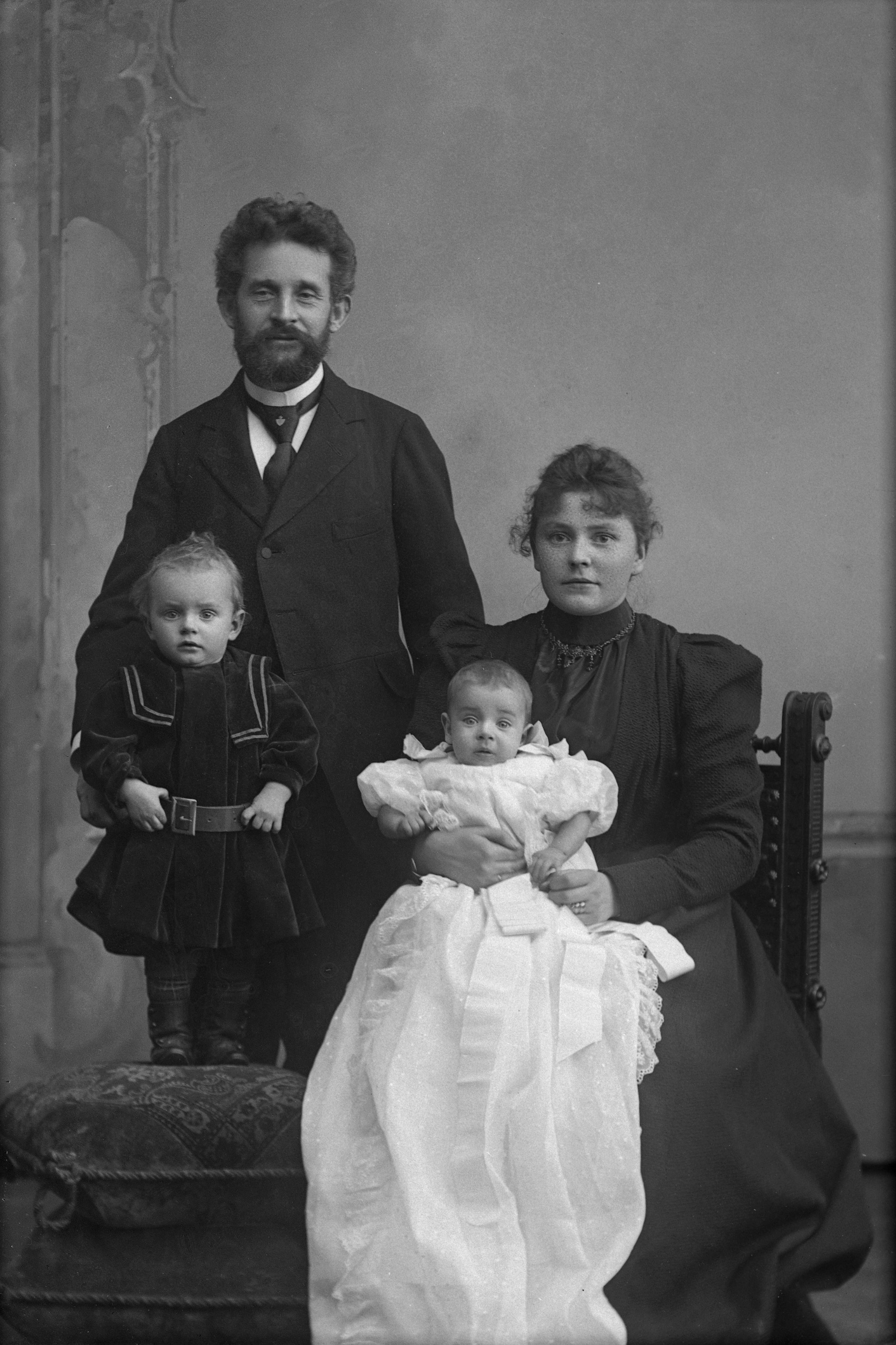 Porträtt i helfigur av fabrikör Nilsson med familj. Äldsta barnet stående på dyna, modern sittande i stol med yngsta barnet, iklädd dopklänning, i knät.