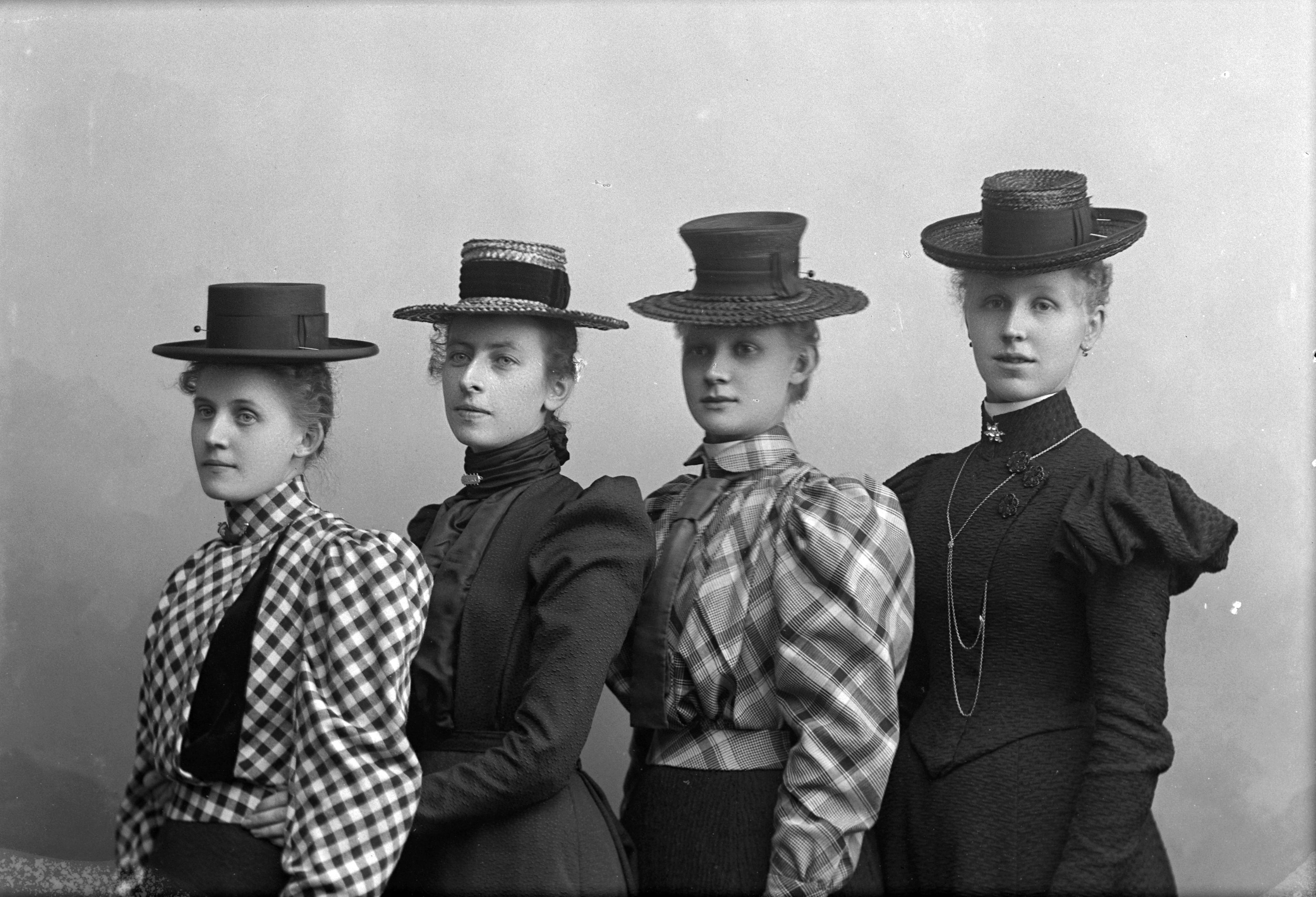 Porträtt helfigur av fröken Kockum med okänt sällskap, tre andra kvinnor, alla iklädda damhattar.