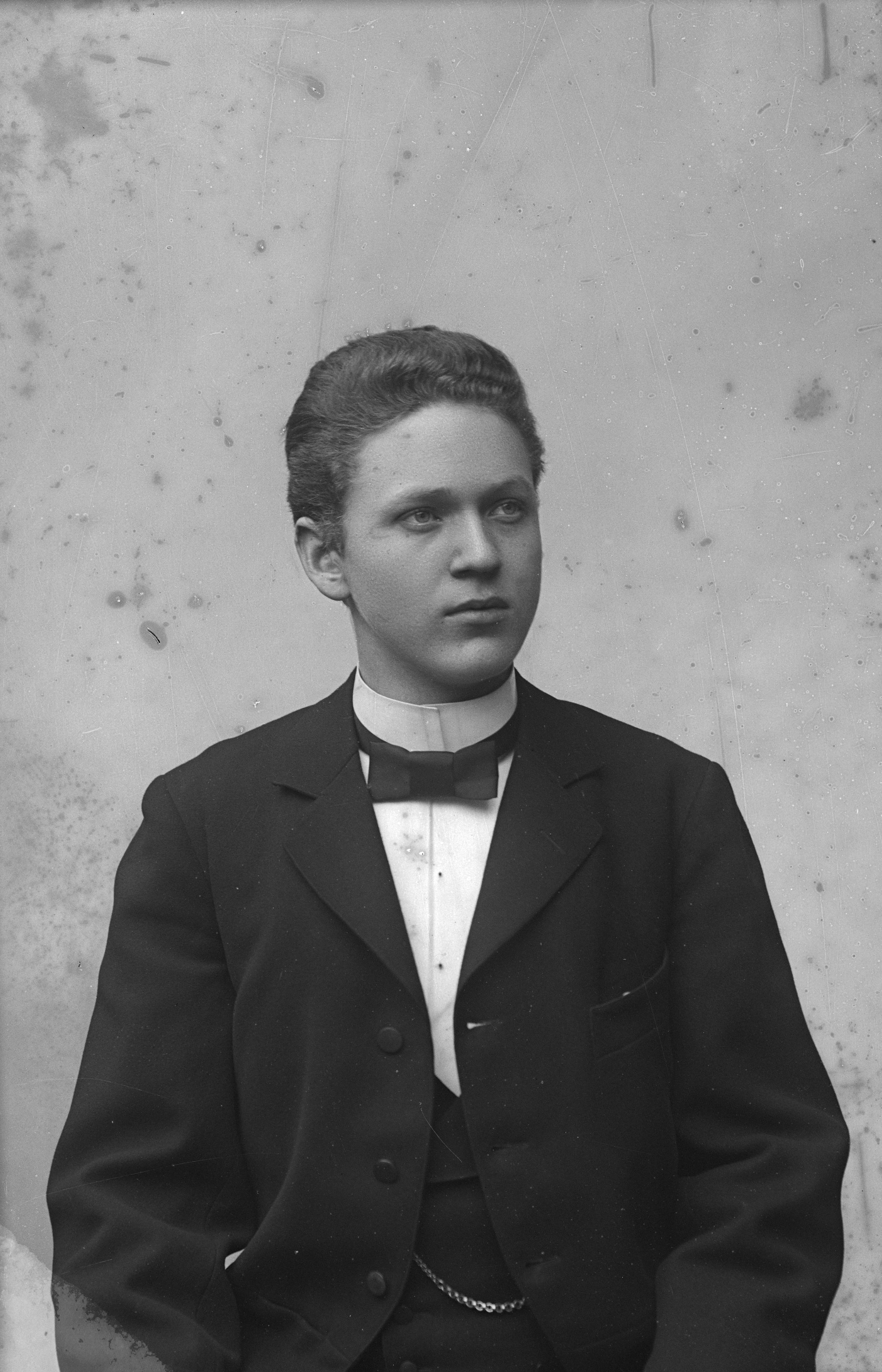 Beskrivning: Porträtt i halvfigur av C. A. Broberg vid Ad. Faxe & Söner.
