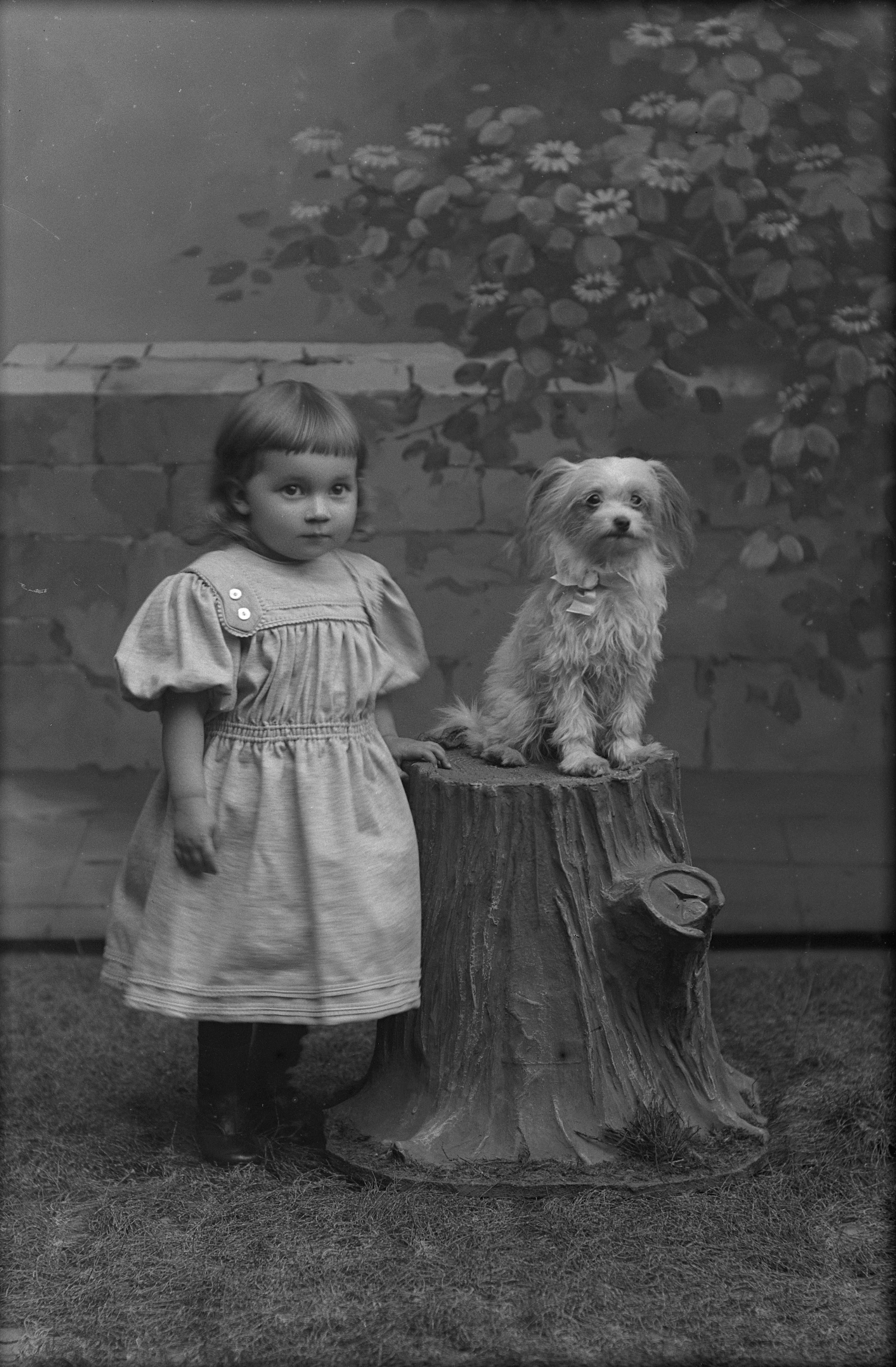 Porträtt i helfigur av Winklers dotter, stående vid stubbe. Bakom henne en tegelmur. På stubben sitter en hund. Fotograferad framför ateljéfond med träd.