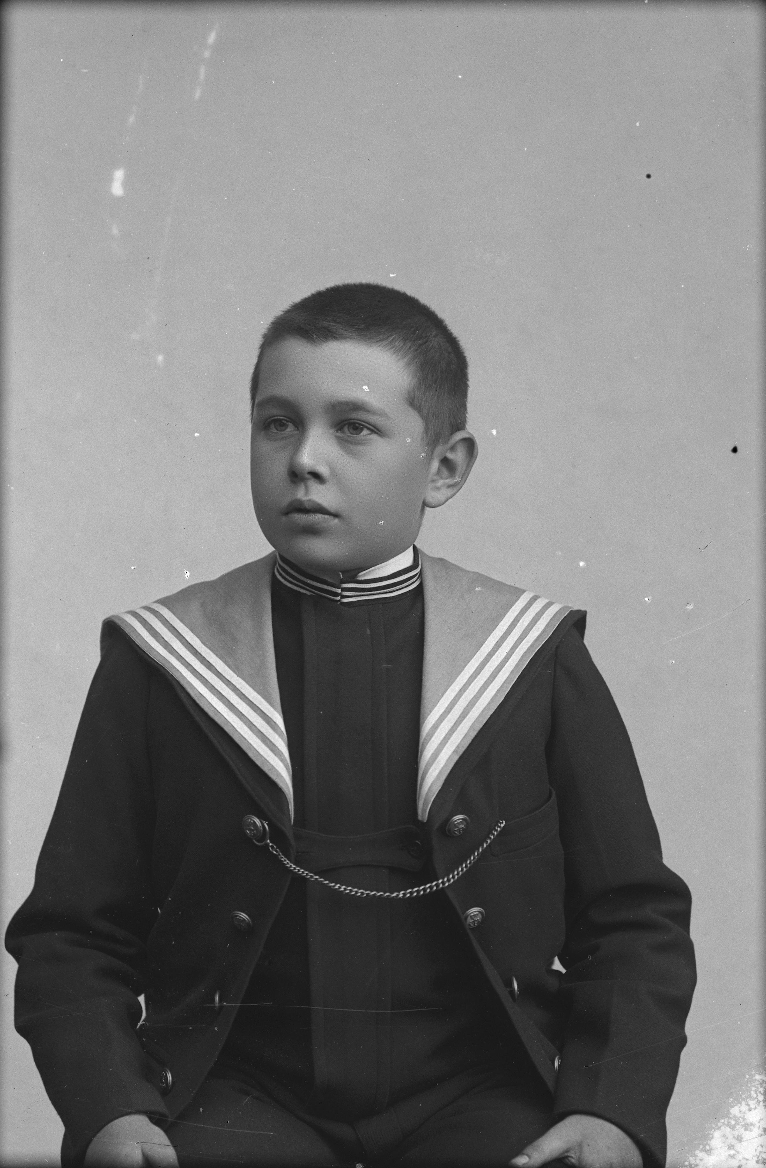 Porträtt i halvfigur av Gadds son, iklädd sjömanskostym.