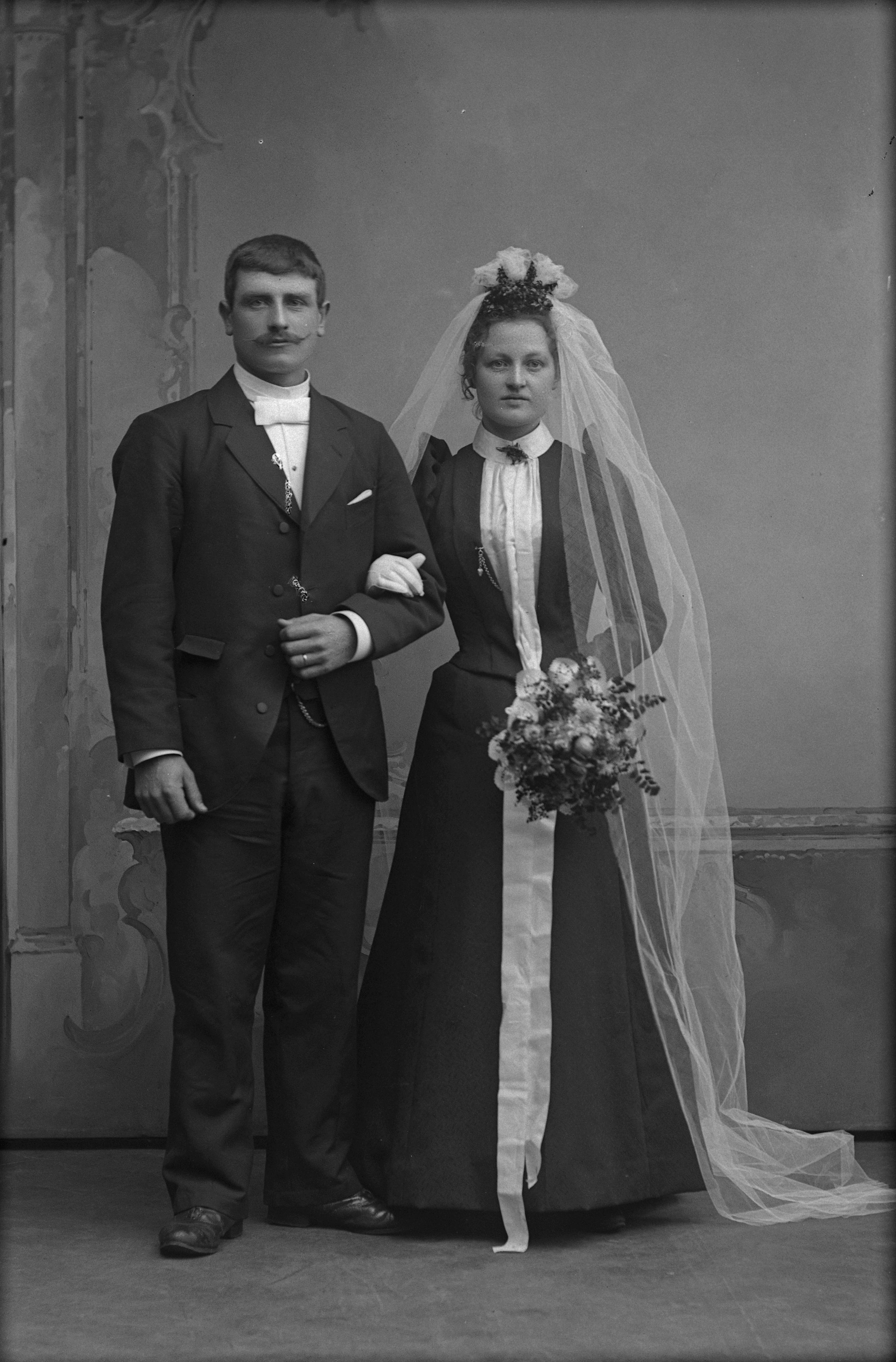 Porträtt i helfigur av Anders Jonasson Svanström med hustrun Carolina Matilda Carlsson. Bruden hållande blombukett.