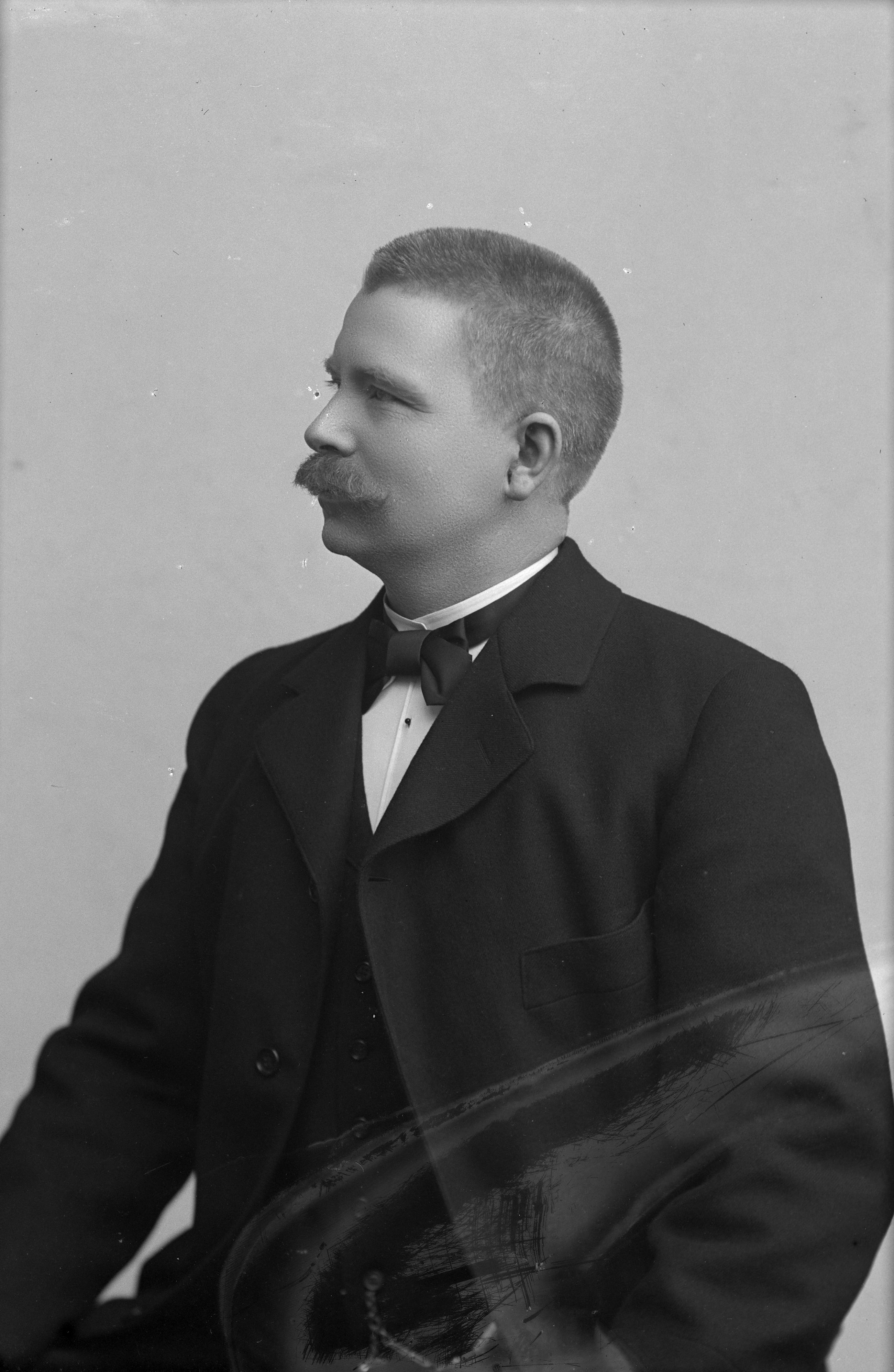Porträtt halvfigur av läderhandlare Månsson, ansikte i profil.