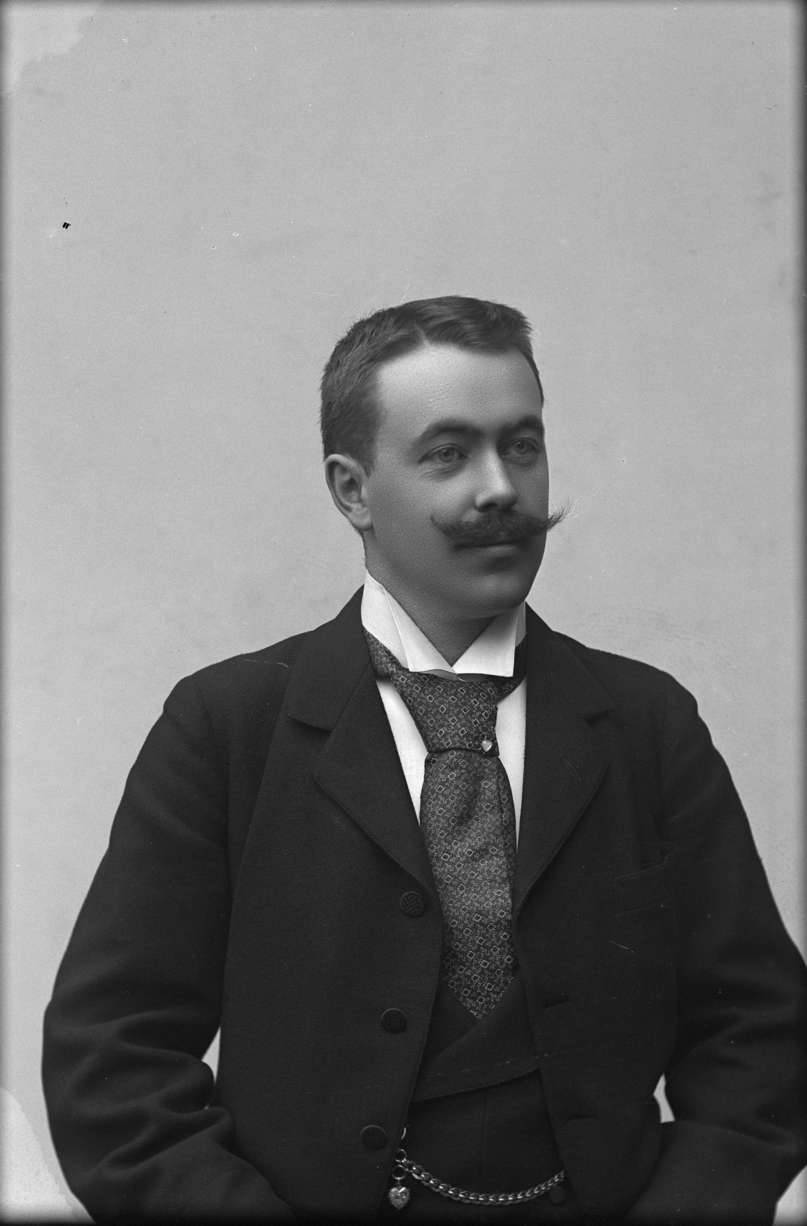 Beskrivning: Porträtt i halvfigur av postexpeditör Carl Lagrelius i Osby.