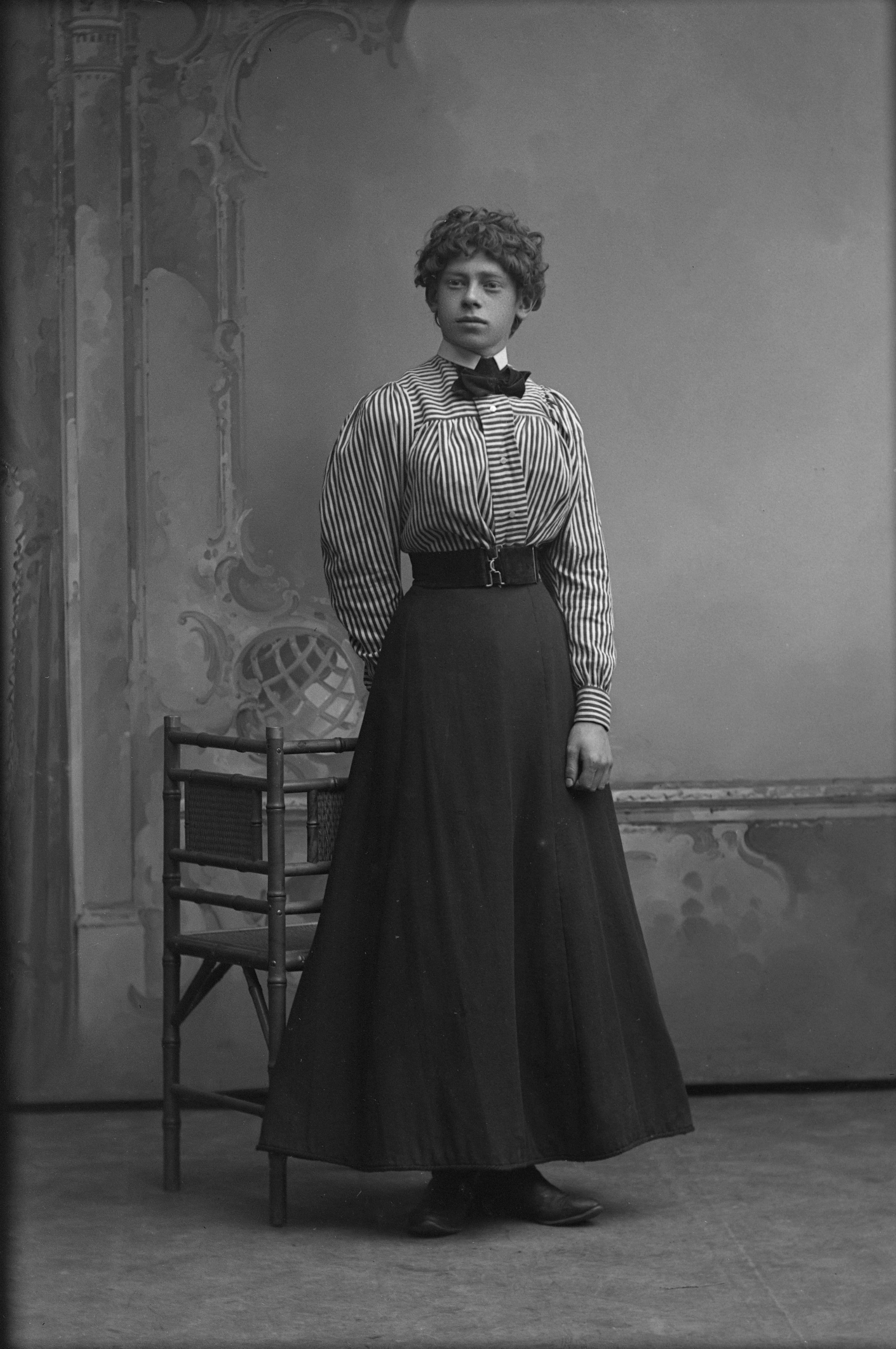 Porträtt i helfigur av oidentifierad kvinna, stående vid stol. Hon bär en stor rosett vid kragen.