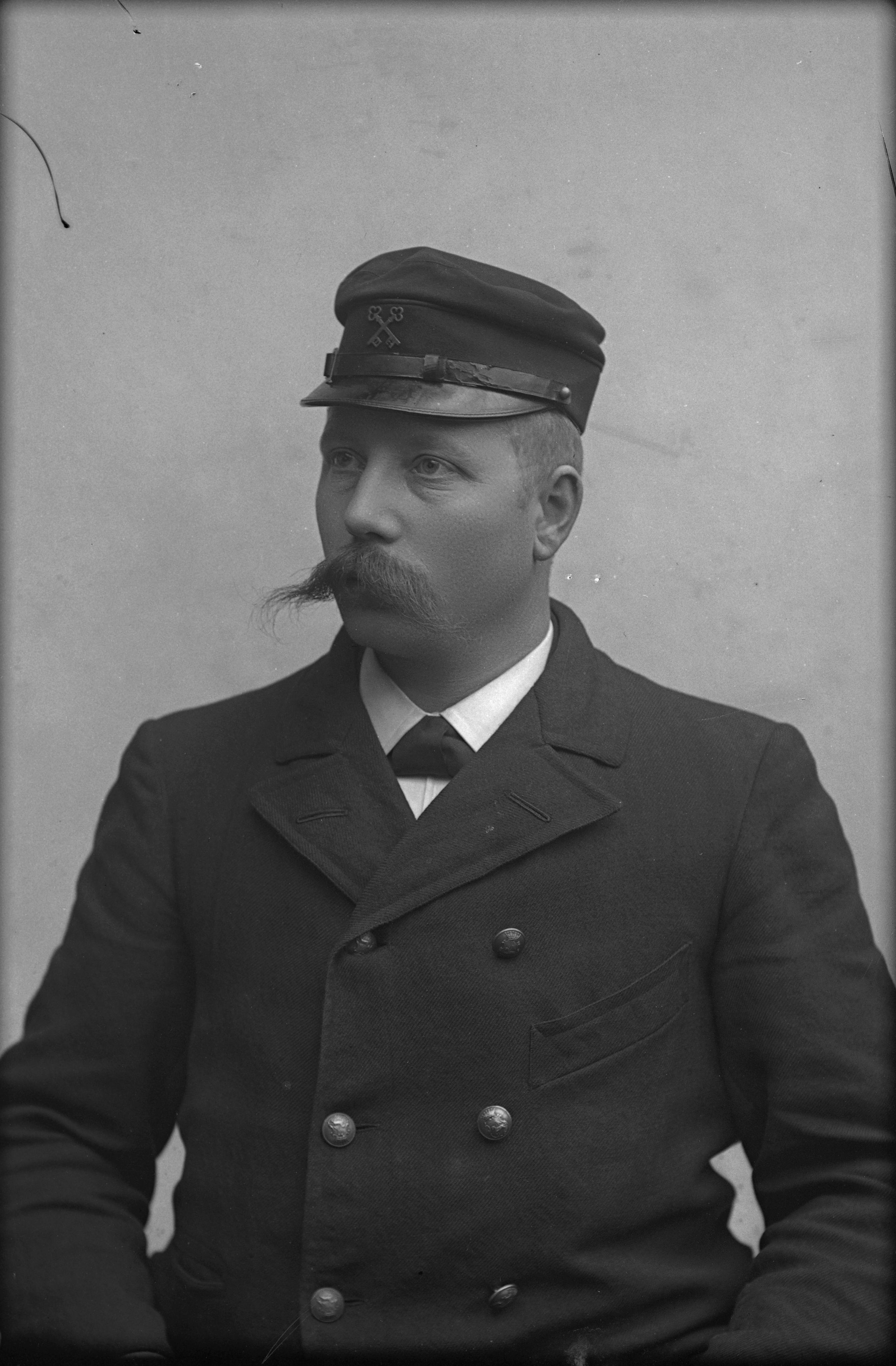Porträtt i halvfigur vaktmästare Lars Malmgren Wallgren, iklädd yrkesklädsel och skärmmössa med emblem, två korslagda nycklar.
