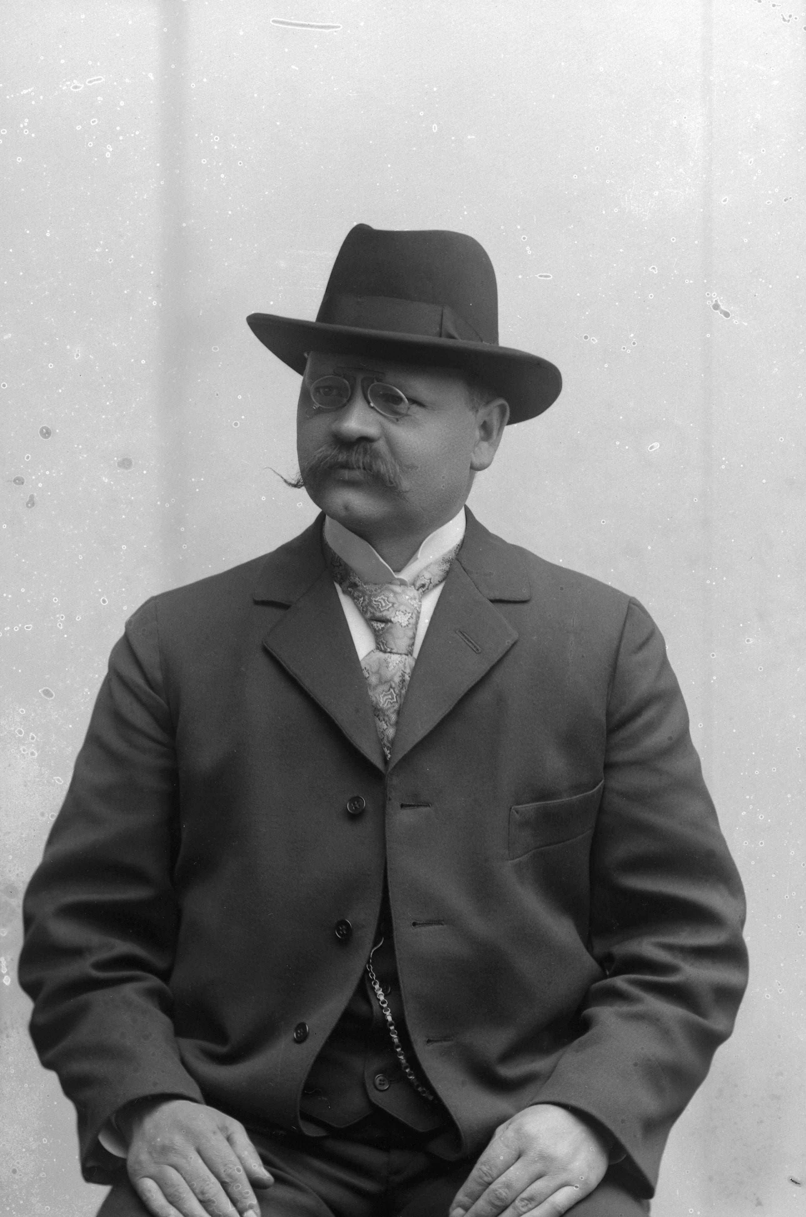 Porträtt i halvfigur av kemist Jöns Håkan Cleving, iklädd hatt.