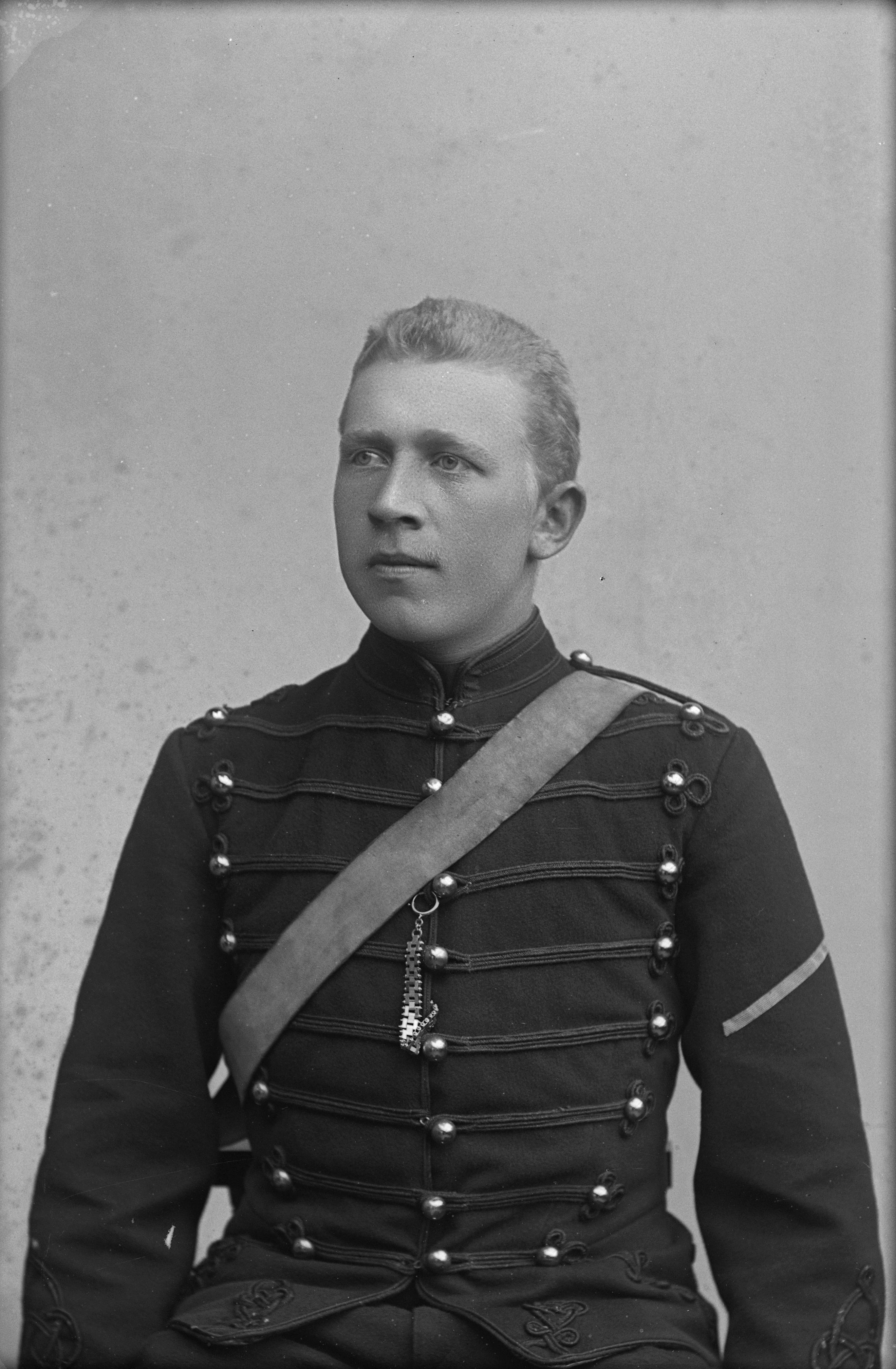 Beskrivning: Porträtt i halvfigur av Olof Lundqvist Vijk iklädd militäruniform.