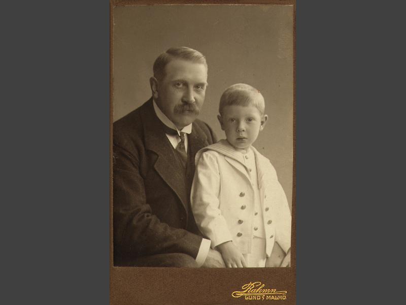 Beskrivning: Visitkortsfotografi. Porträtt av kalkbruksdirektör Ernst Åkerman med sonen Bertil.