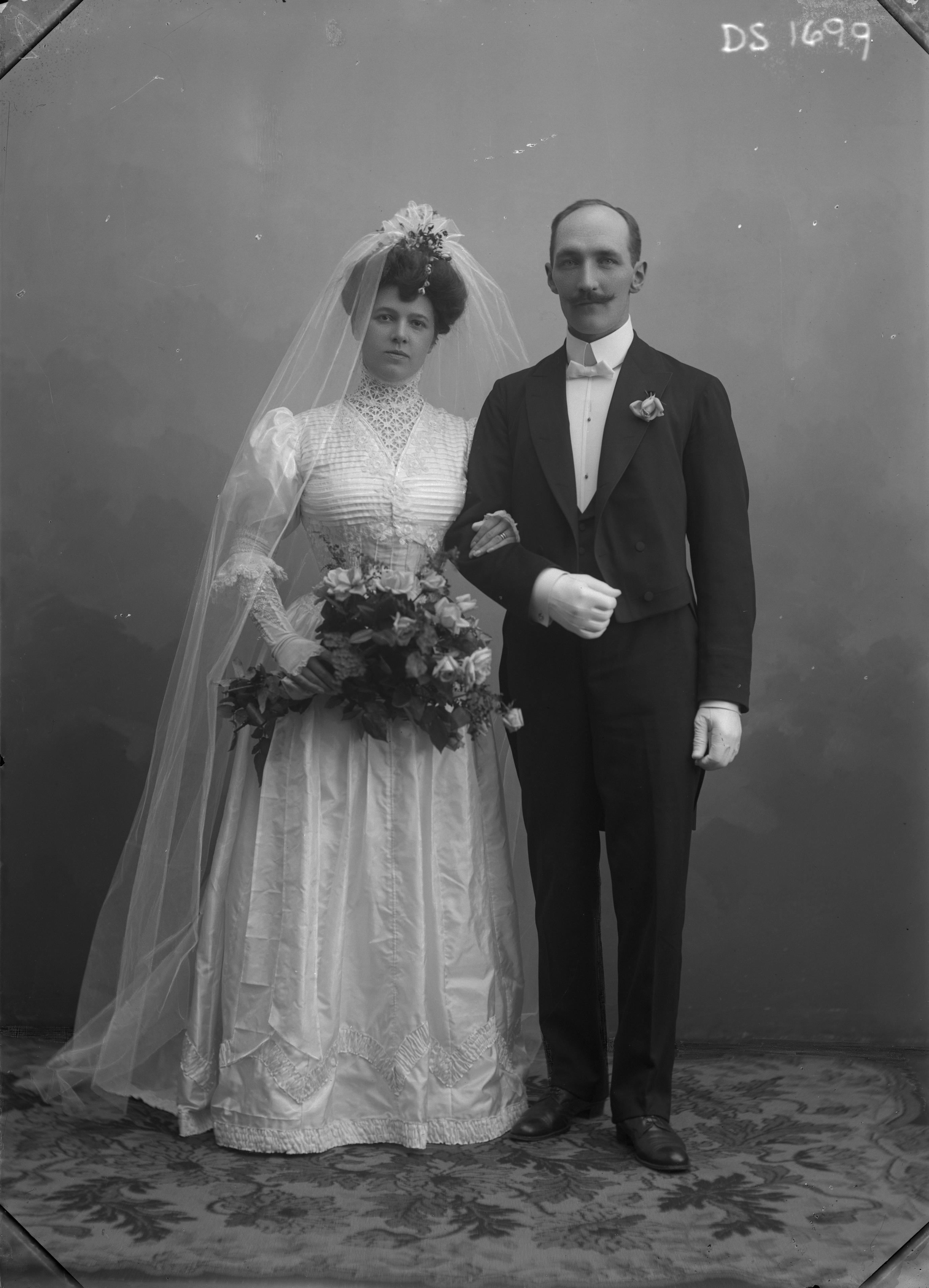 Porträtt i helfigur av handelsmannen Per Marin Lundvall med sin brud Anna Maria Johansson. Fotograferade dagen efter sitt bröllop.