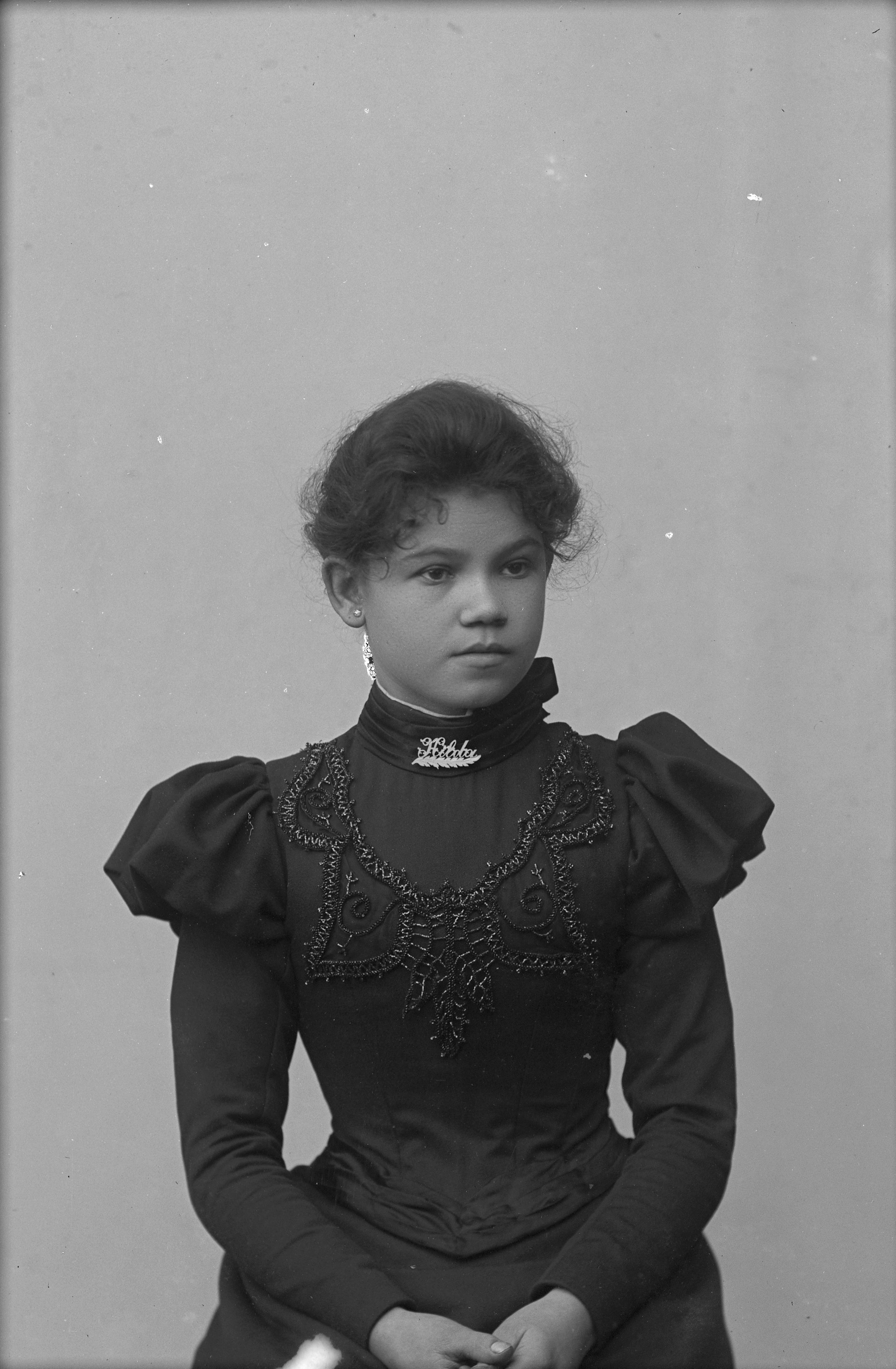 Beskrivning: Porträtt i halvfigur av Hilda Andersson.