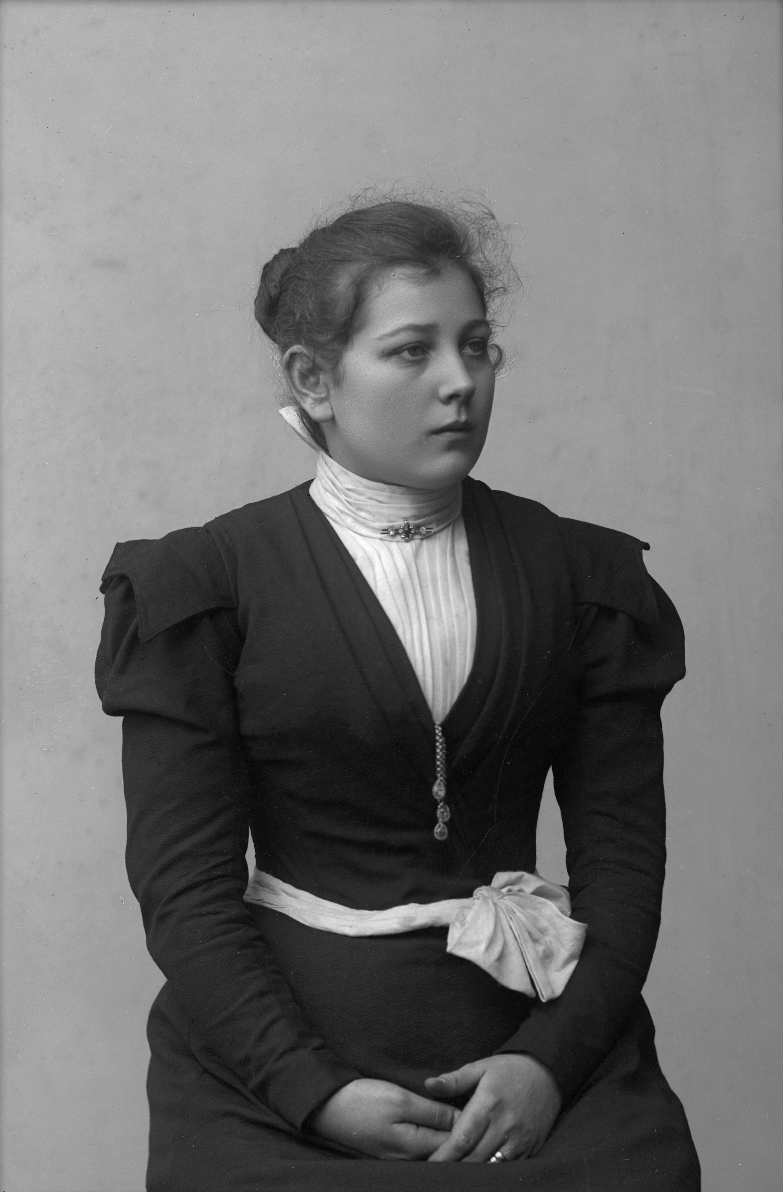 Beskrivning: Porträtt i halvfigur av Frida Nelander.