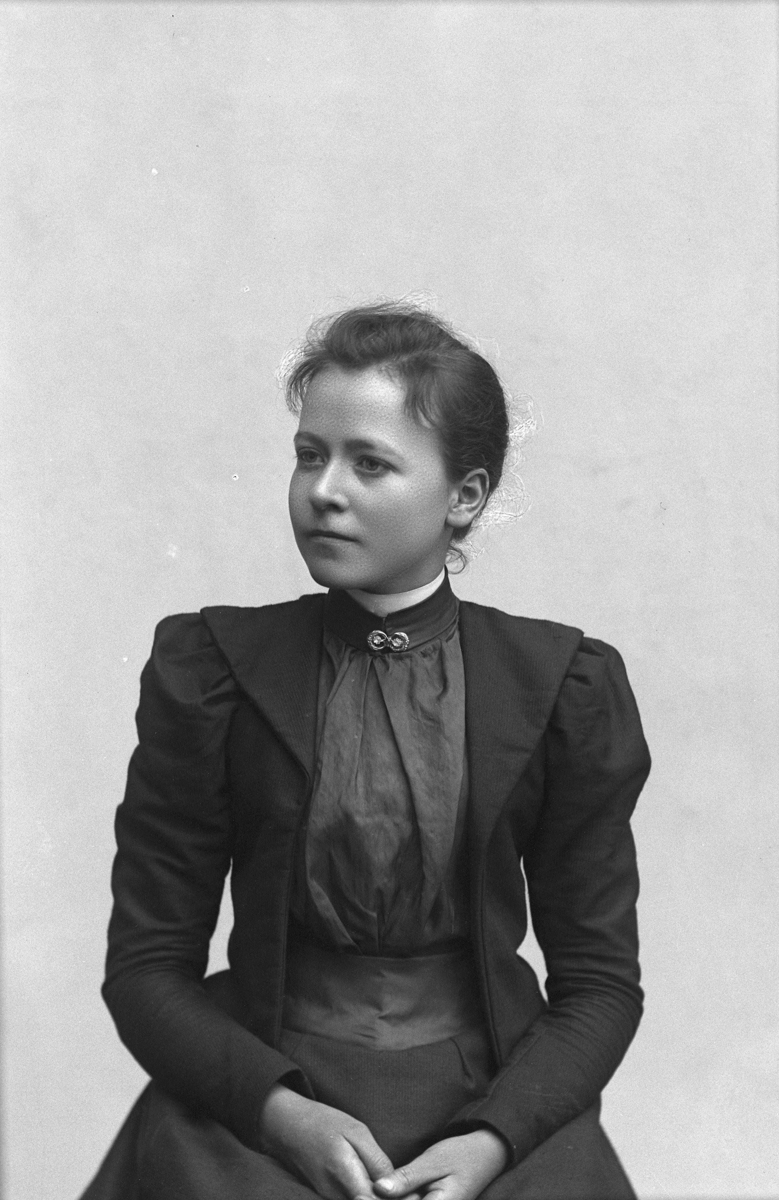 Beskrivning: Porträtt i halvfigur av Alma Persson.