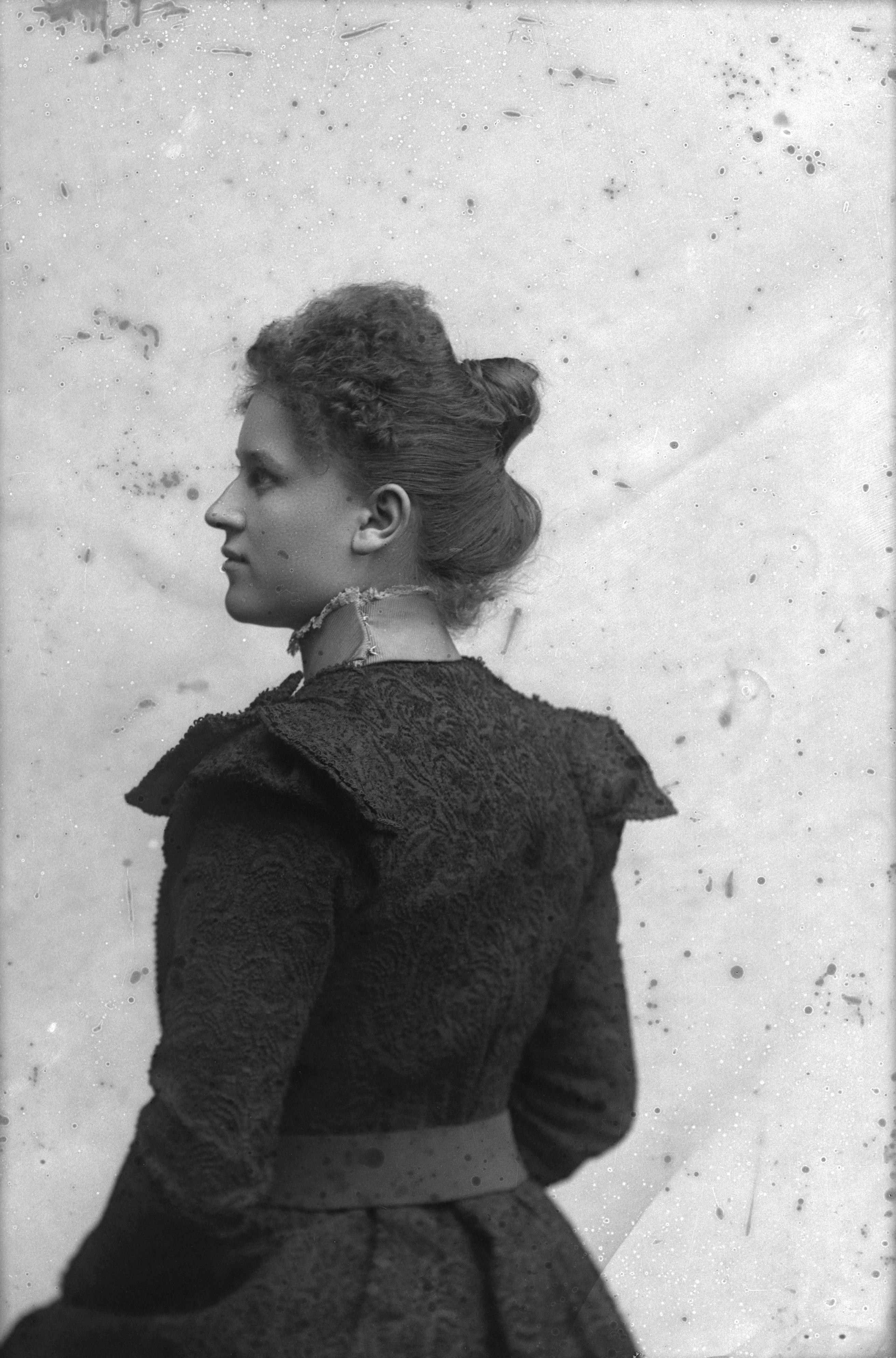 Porträtt i halvfigur av Olga Lagerholm, rygg snett mot kameran, ansikte i profil.