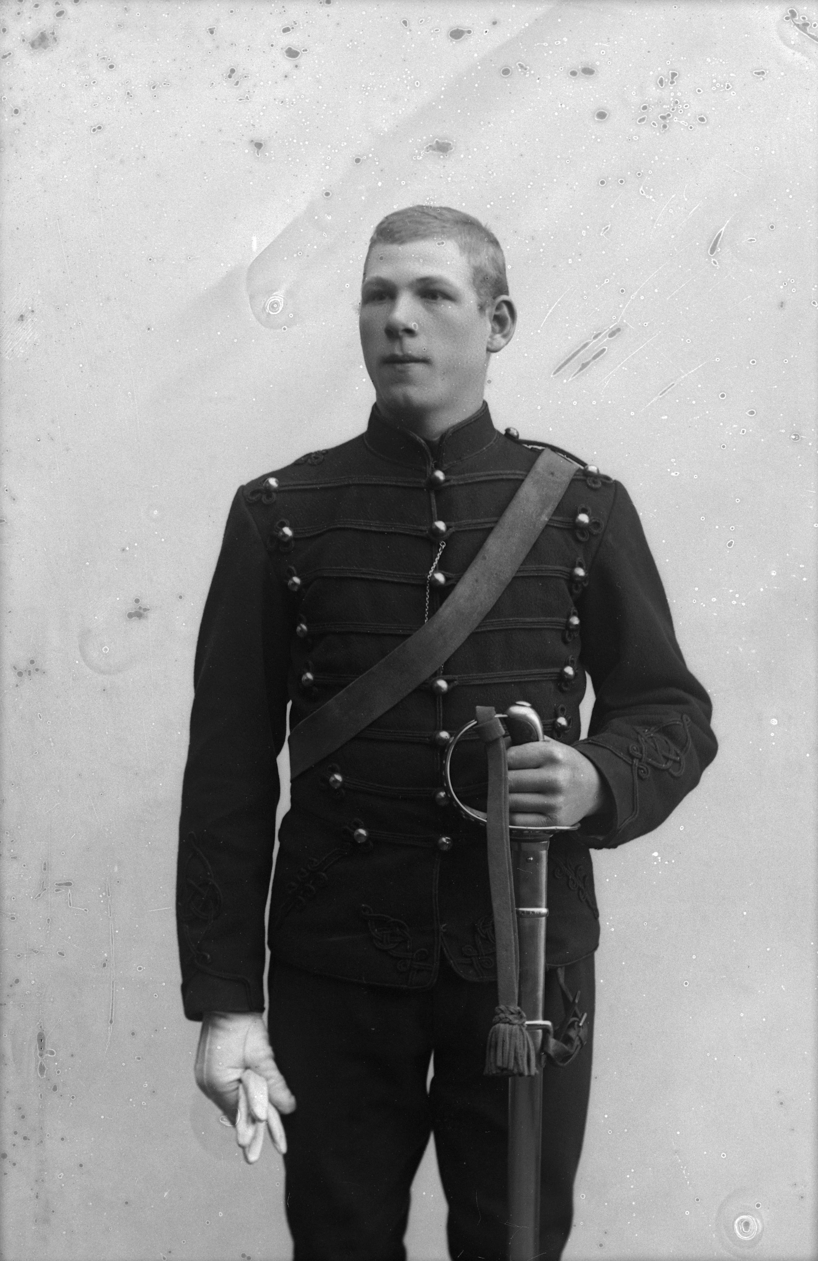 Porträtt i helfigur av husar A. Lindberg, iklädd militäruniform, hållande sabel.