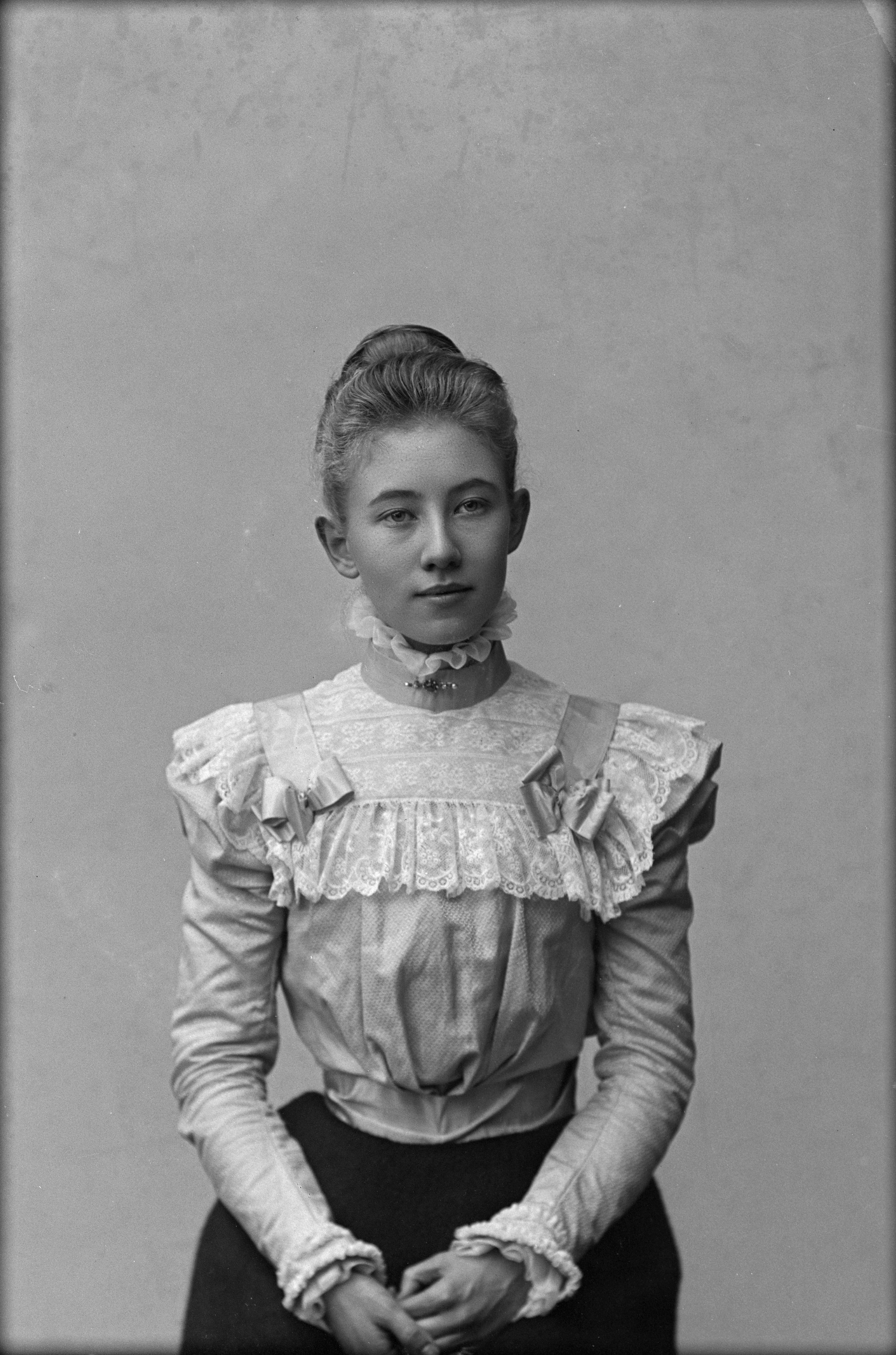 Beskrivning: Porträtt i helfigur av Betty Olsson. Visitkort med ateljélogotyp "Sjöberg /Malmö".