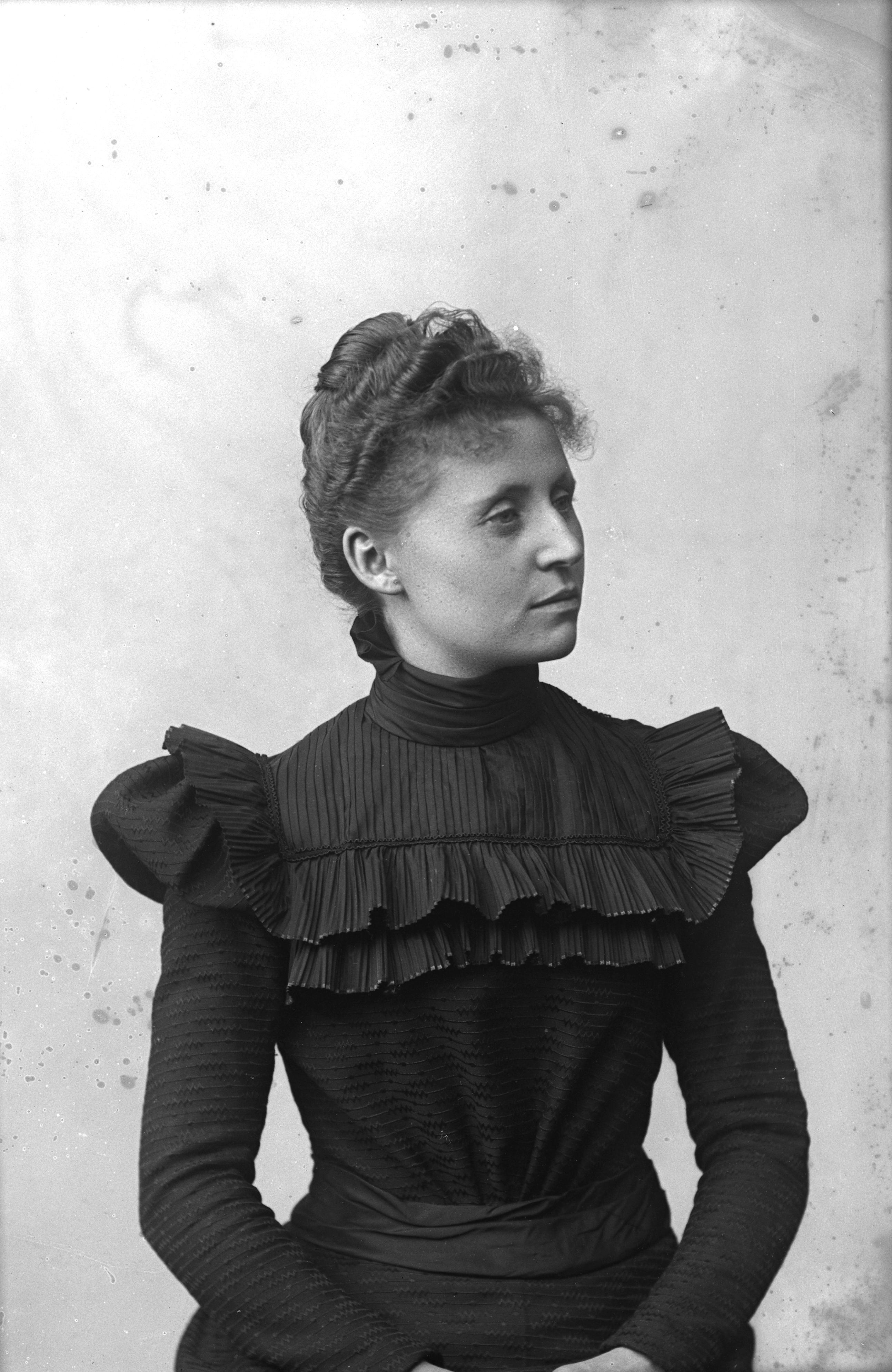 Beskrivning: Porträtt i halvfigur av Karin Dahlquist.