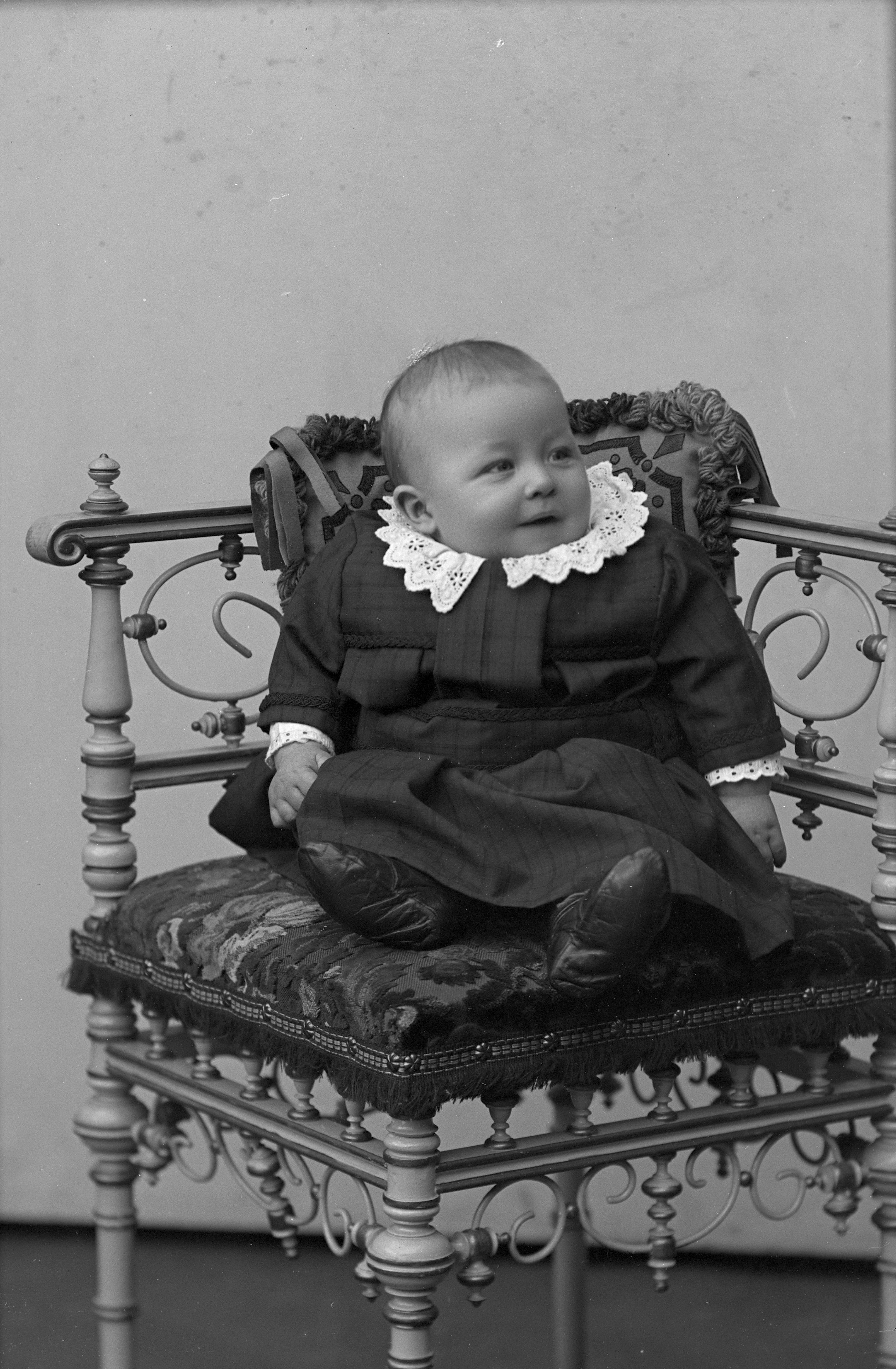 Porträtt i helfigur av Gustafssons son, sittande i stol.