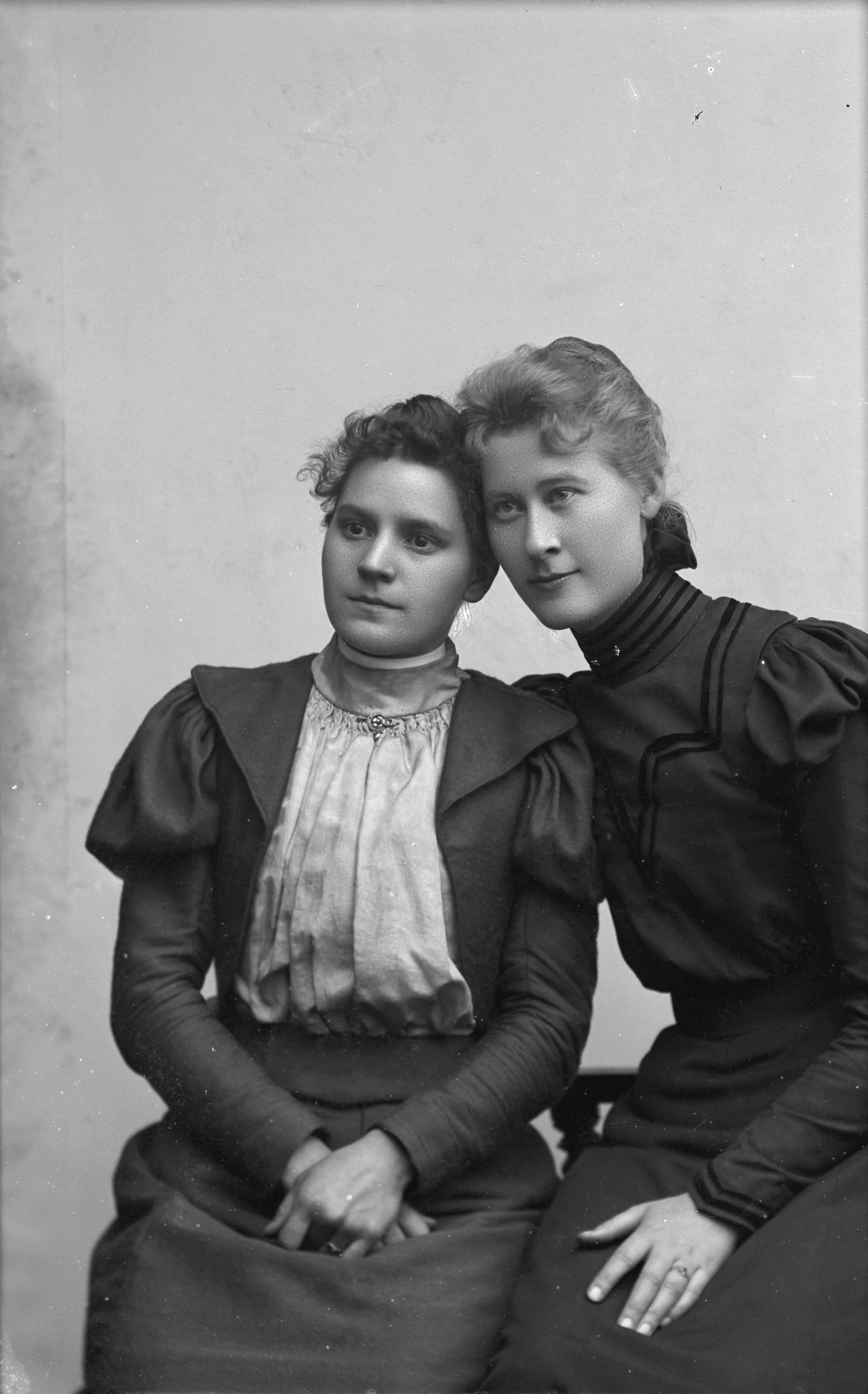 Beskrivning: Porträtt i helfigur av Hulda Nilsson med okänd kvinna.