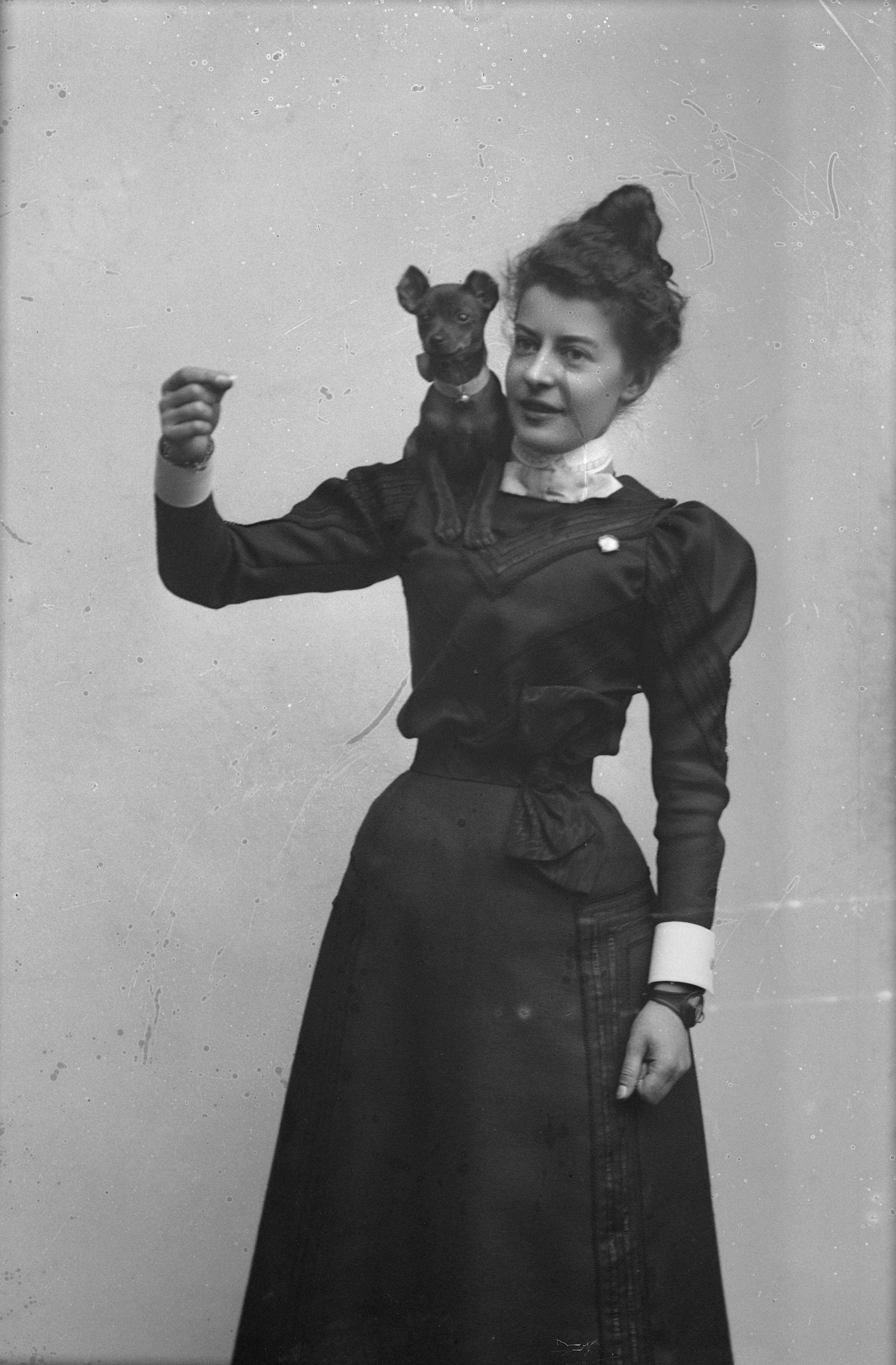 Porträtt i helfigur av Wanda Katarina Bartels, med hund sittande på axeln.
