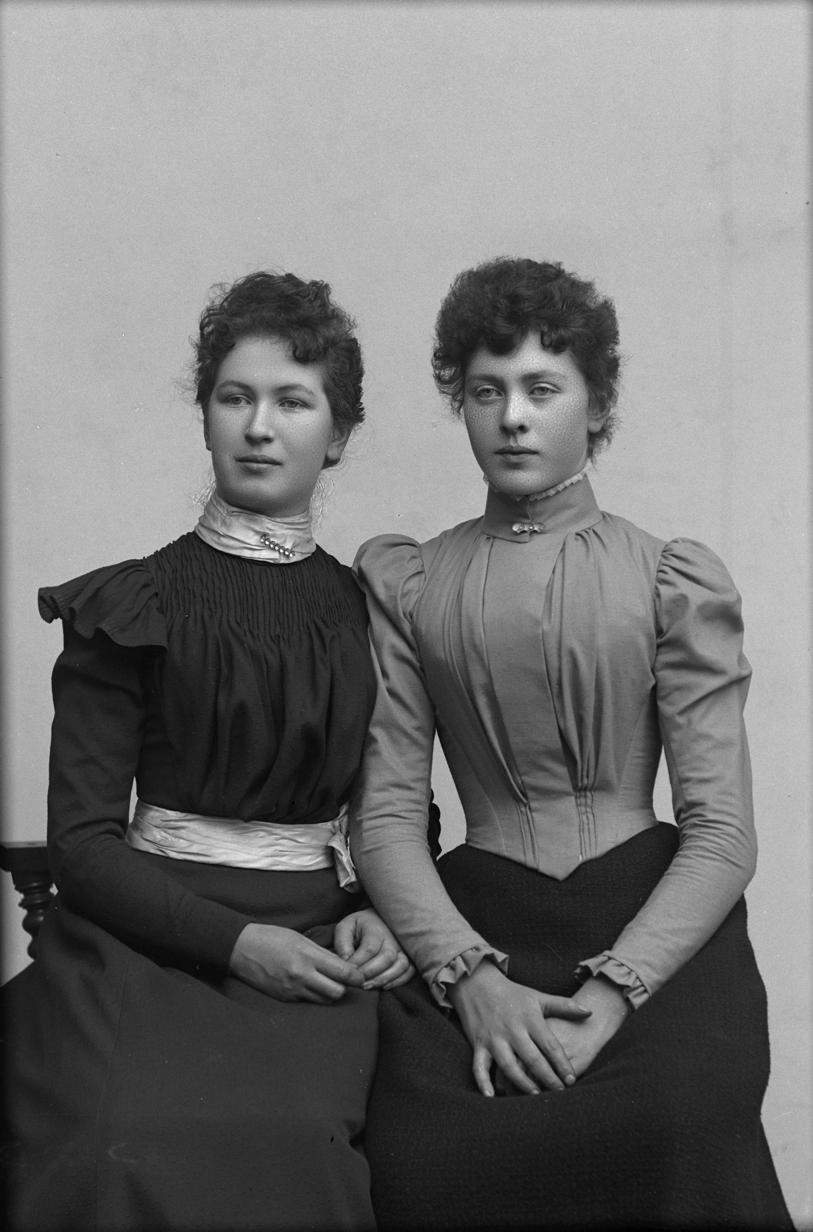 Beskrivning: Porträtt i helfigur av Alma Magnusson med okänd kvinna.