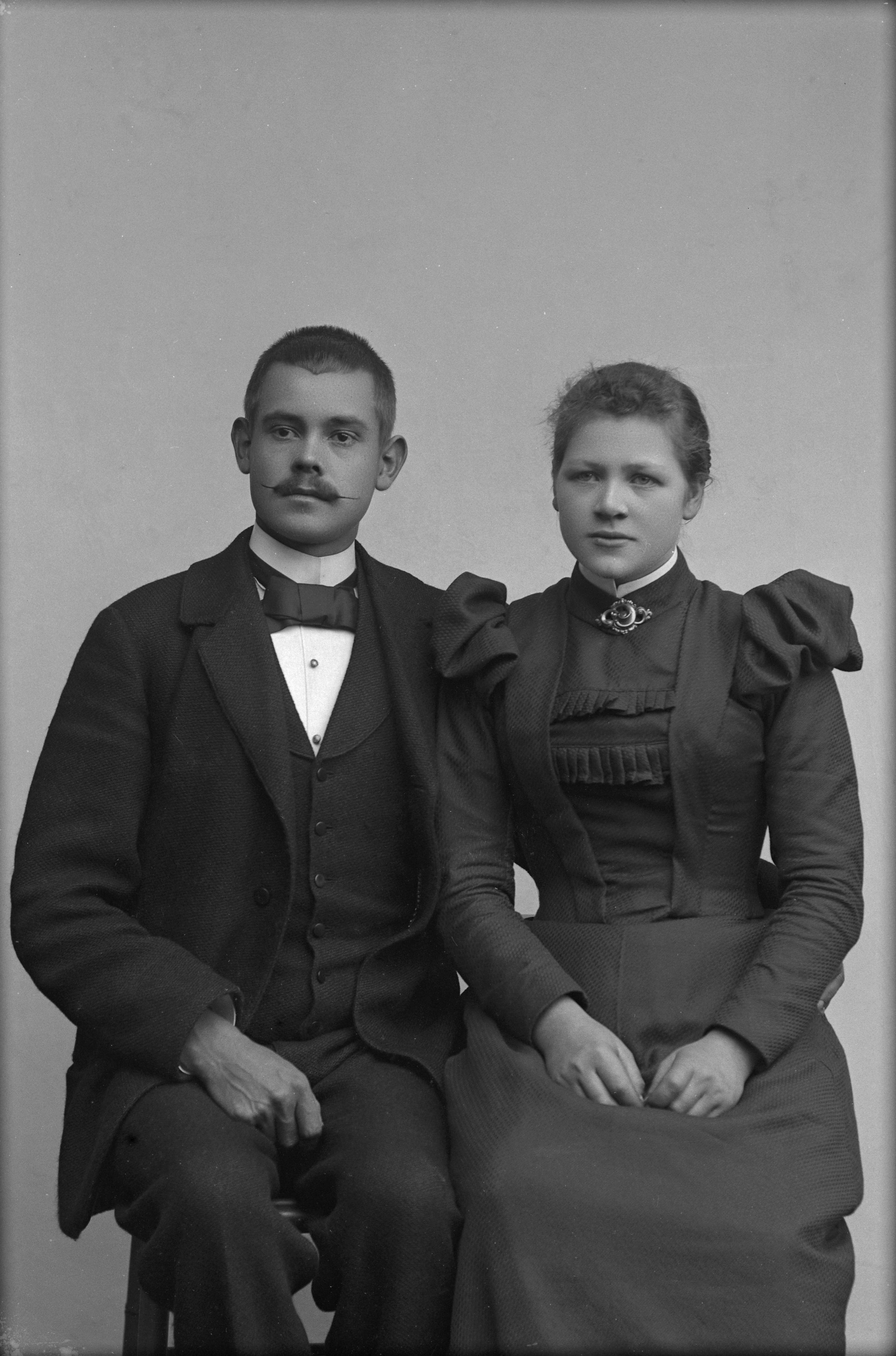 Beskrivning: Porträtt i helfigur av A. Persson med fru.