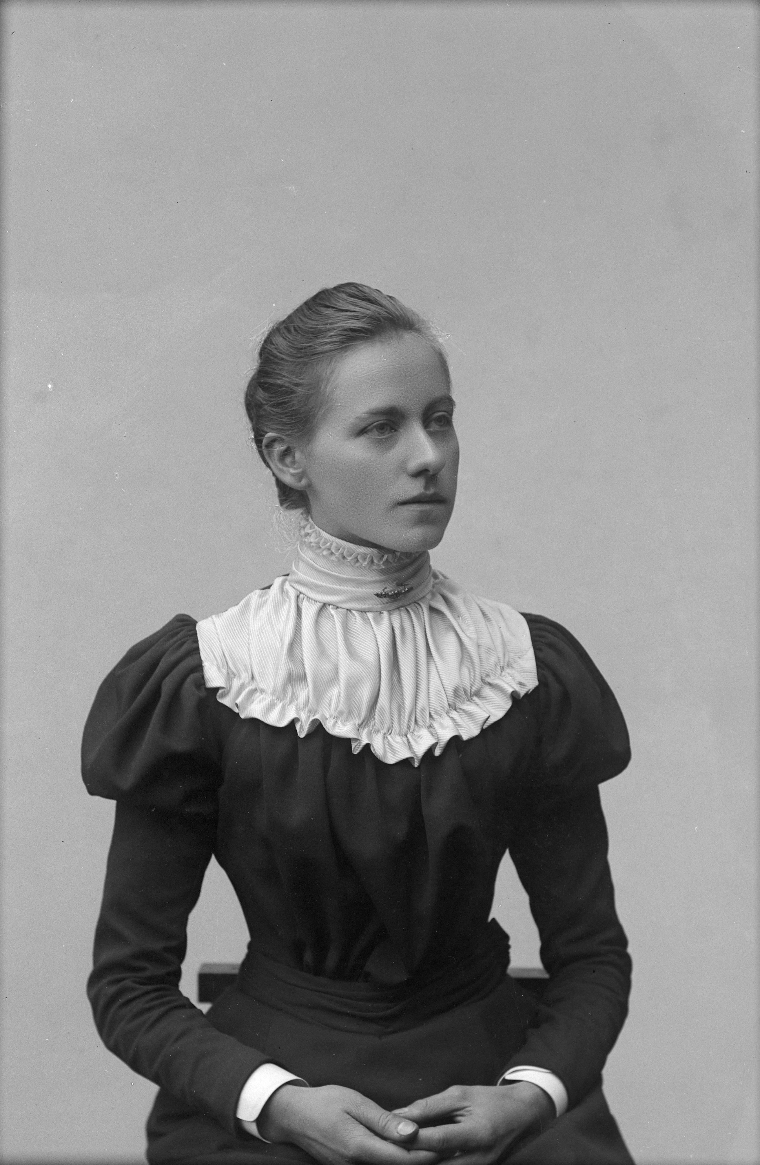 Beskrivning: Porträtt i halvfigur av Maria Forslund.